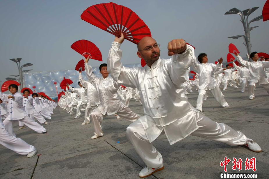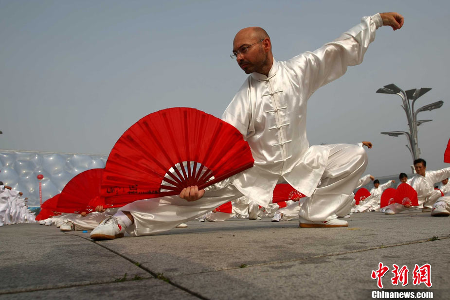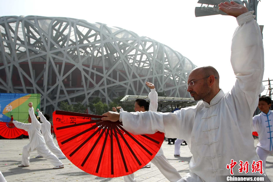 8月14日,為慶祝8月8日全民健身日和紀(jì)念北京奧運(yùn)會(huì)舉辦兩周年,“北京奧運(yùn)城市體育文化節(jié)--萬(wàn)人健身氣功展示活動(dòng)”在北京奧林匹克公園景觀大道舉行,近萬(wàn)名中外民眾展示了五禽戲、八段錦和太極功夫扇三段健身氣功。圖為來(lái)自西班牙的中國(guó)氣功愛(ài)好者卡洛斯參與展示,他從2006年開(kāi)始每年都要來(lái)中國(guó)三個(gè)月專(zhuān)心學(xué)習(xí)中國(guó)氣功。中新社發(fā) 富田 攝