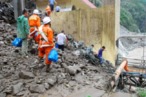 8月14日,舟曲災區救援官兵晝夜展開清淤工作。截至當日,影響大型機械進入舟曲重災區的部分街道已經暢通。蘭州軍區某集團軍工兵團從13日晚上9點到14日上午9點,出動80人、3臺挖掘機、4臺裝載機、21臺裝卸車,在舟曲縣城南街清理廢墟。經過一晚奮戰,清理淤泥200立方米,街道已基本暢通。中新網記者 金碩 攝
