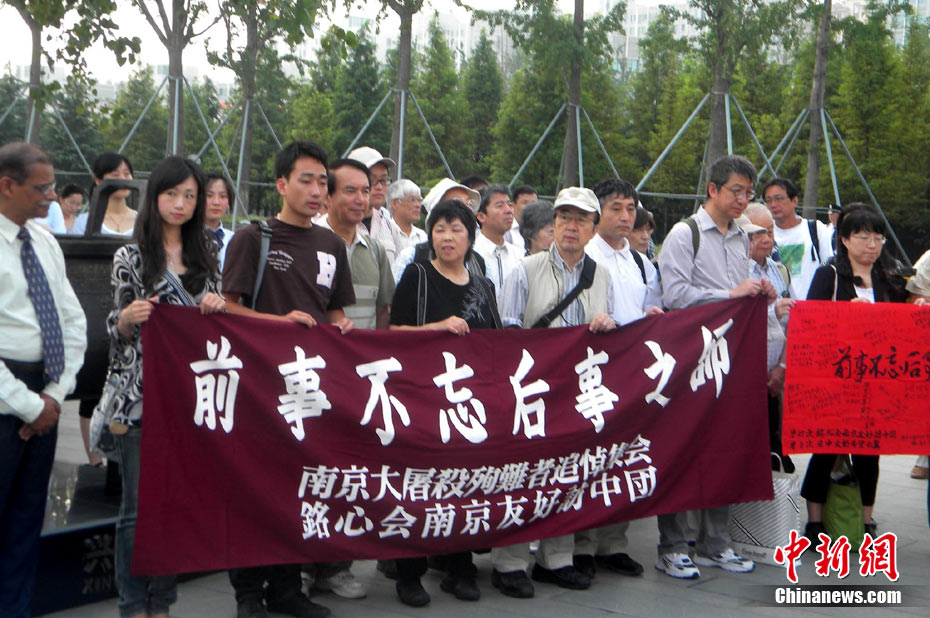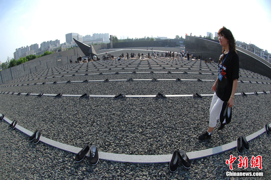 為紀念二戰期間在日本遇害的6830名被強擄的中國勞工,8月14日下午,在侵華日軍南京大屠殺遇難同胞紀念館廣場,被擄勞工中的幸存者及遇難者家屬、日本友人等近50人舉行了6830雙布鞋擺放活動。中新社發 江法 攝 圖片來源:cnsphoto
