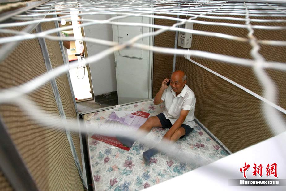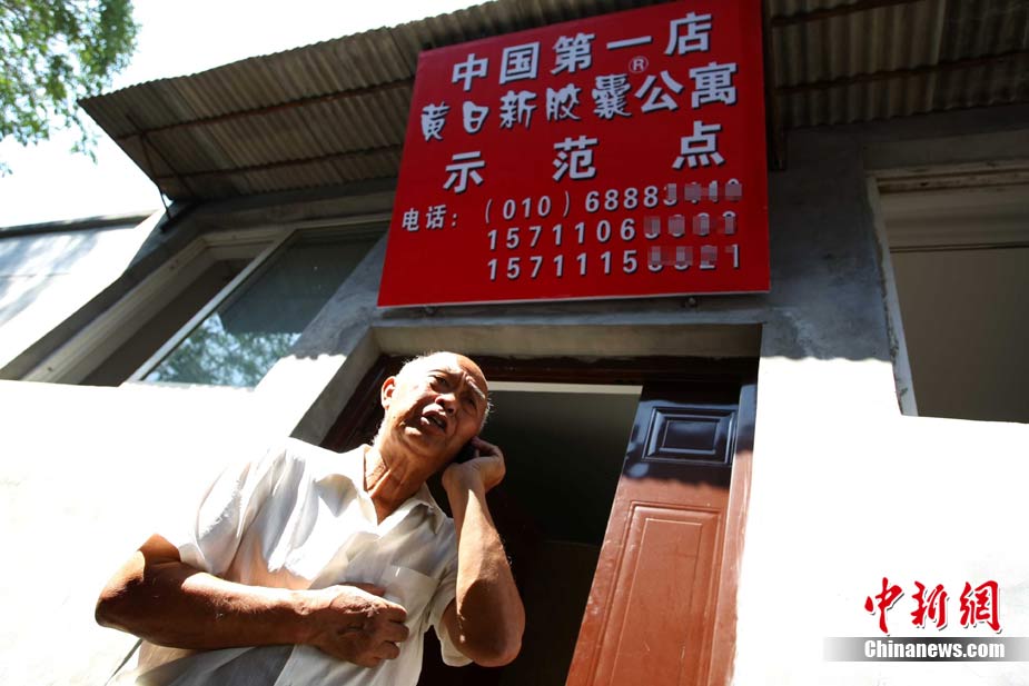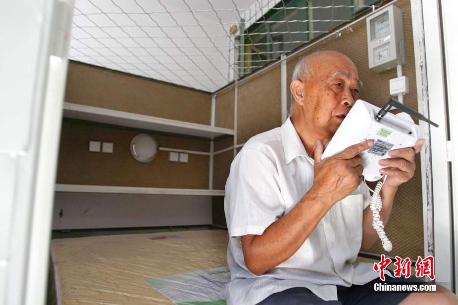 8月16日,在北京石景山區(qū)麻峪東街,78歲老人黃日新所建的第三代膠囊公寓開張。第三代膠囊公寓設有單人間和夫妻間(圖),大小為長2.4米、寬1.2米(夫妻房寬1.6米)、高2米。每個膠囊房間采用席夢思床墊,在電腦桌上方安置床頭柜,安裝獨立電表,并增設廚房和廁所。中新社發(fā) 富田 攝