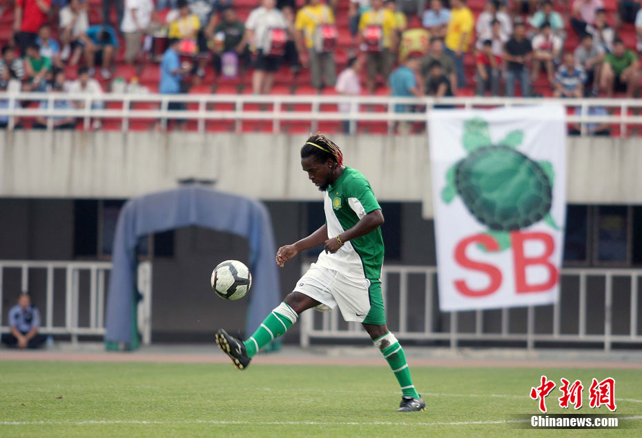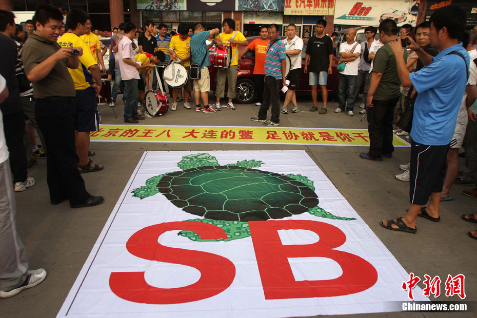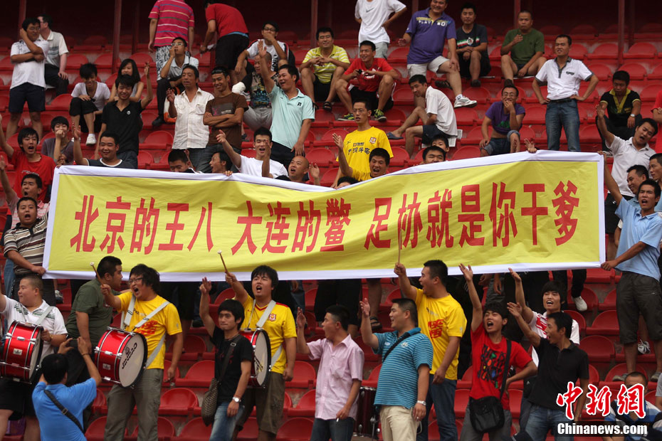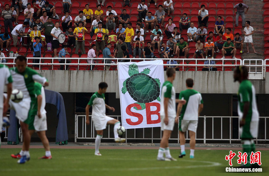 2010年8月17日,西安,北京國安隊在陜西省體育場備戰(zhàn)中超聯(lián)賽第19輪和陜西隊的客場比賽。陜西球迷“組團”來到現(xiàn)場,用持續(xù)不斷的罵聲干擾國安隊戰(zhàn)前的踩場訓(xùn)練,球迷們還打出了“綠烏龜”的畫幅和各種標語暗諷國安。中新社發(fā) 梁萌 攝 圖片來源:CNSPHOTO