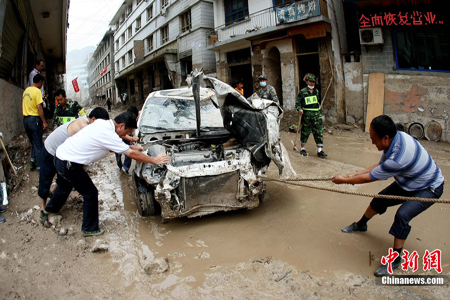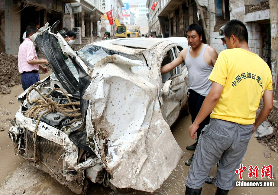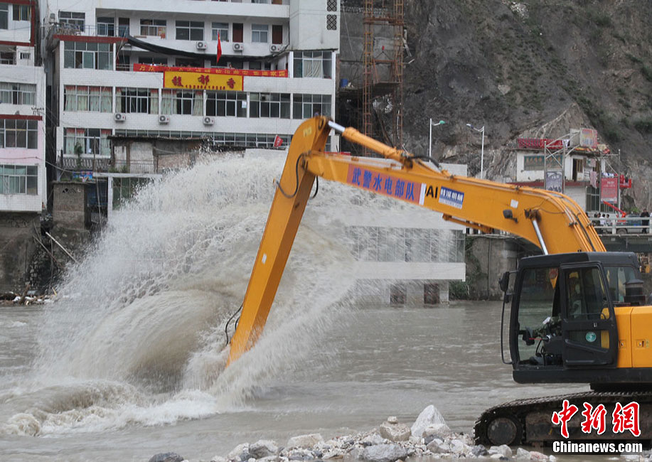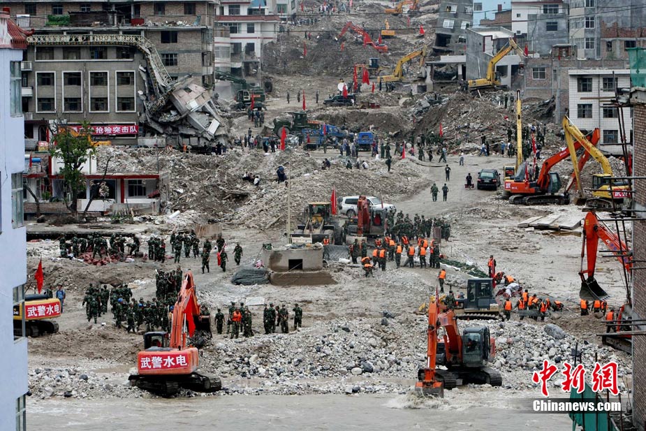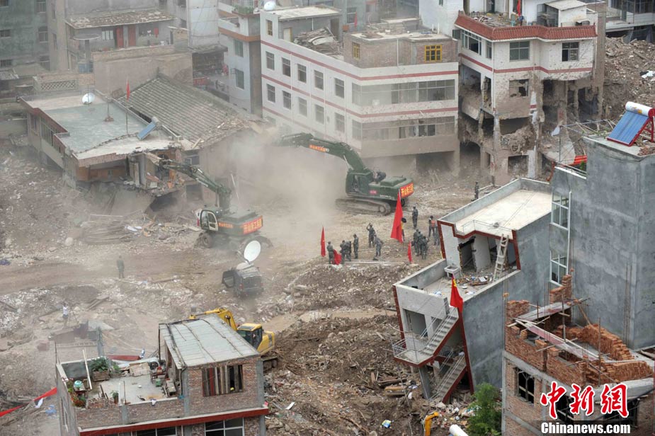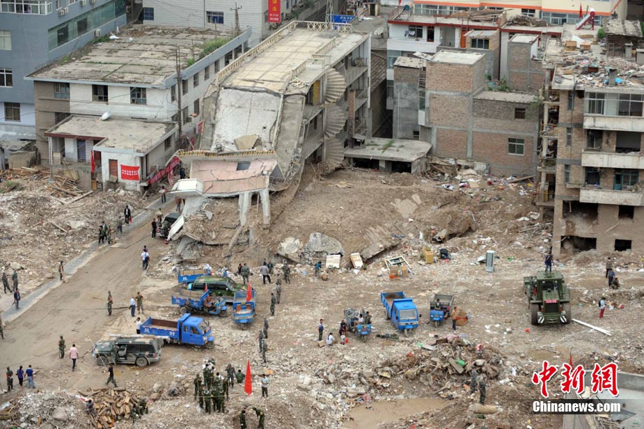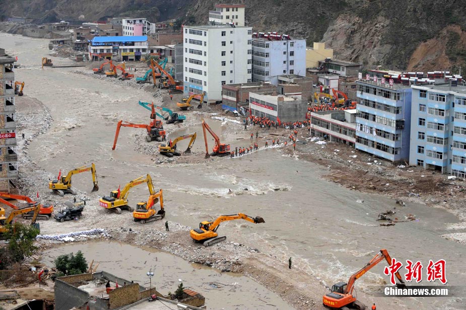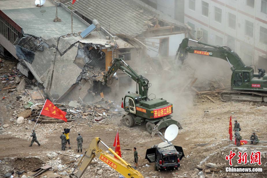 8月18日上午,由蘭州軍區某集團軍“開山斧工兵團”大型機械對舟曲特大山洪泥石流災害所致三眼峪重災區危樓進行拆除。中新社記者 陳文 攝