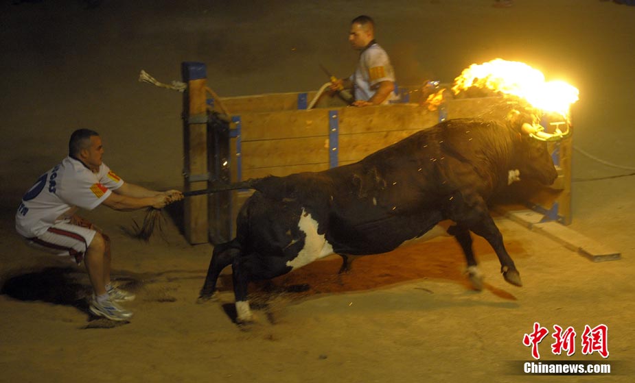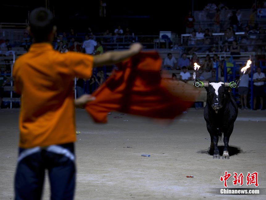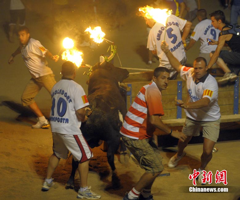 近日,在西班牙安波斯塔市,舉行“奔火牛”活動。“奔火牛”是西班牙東部地區的傳統節日慶典活動。在活動中,公牛的犄角被綁上火把滿場飛奔,場面驚險刺激。