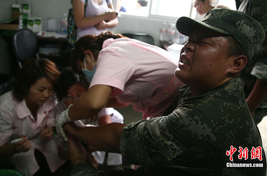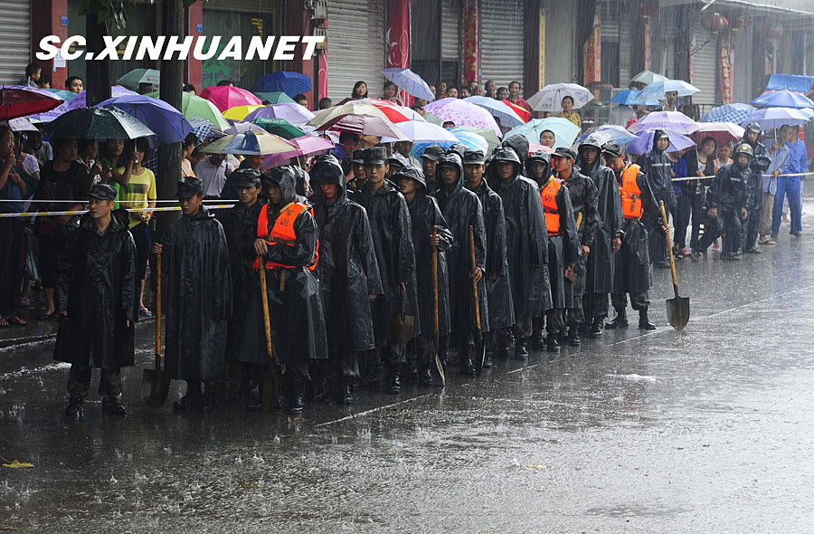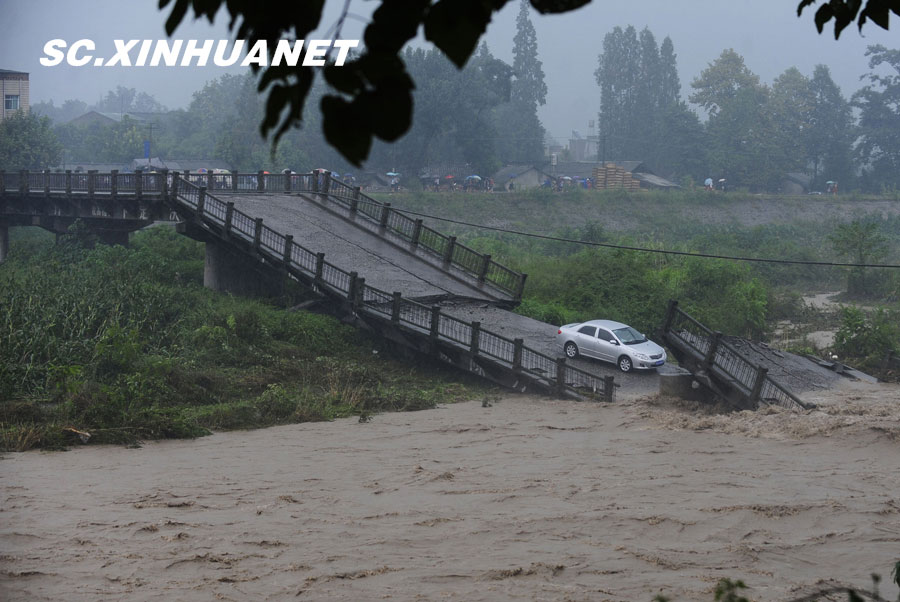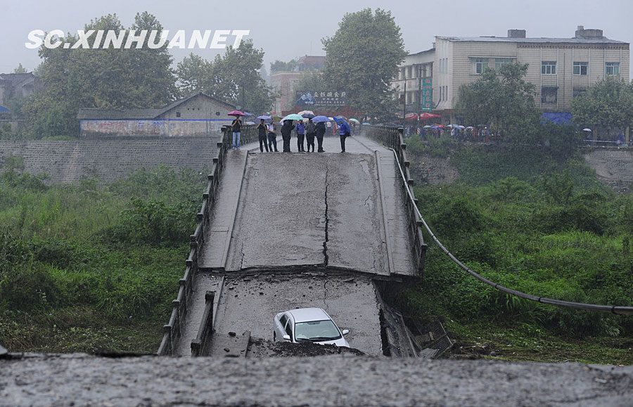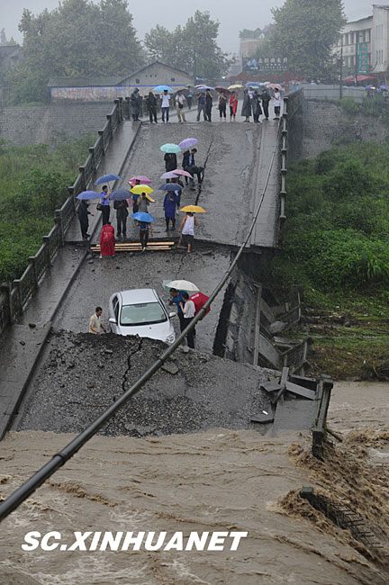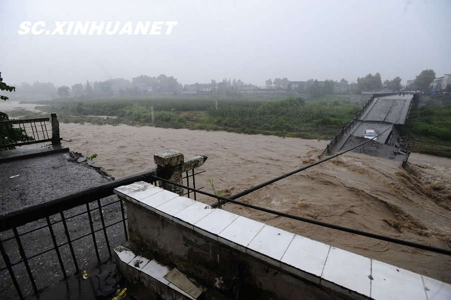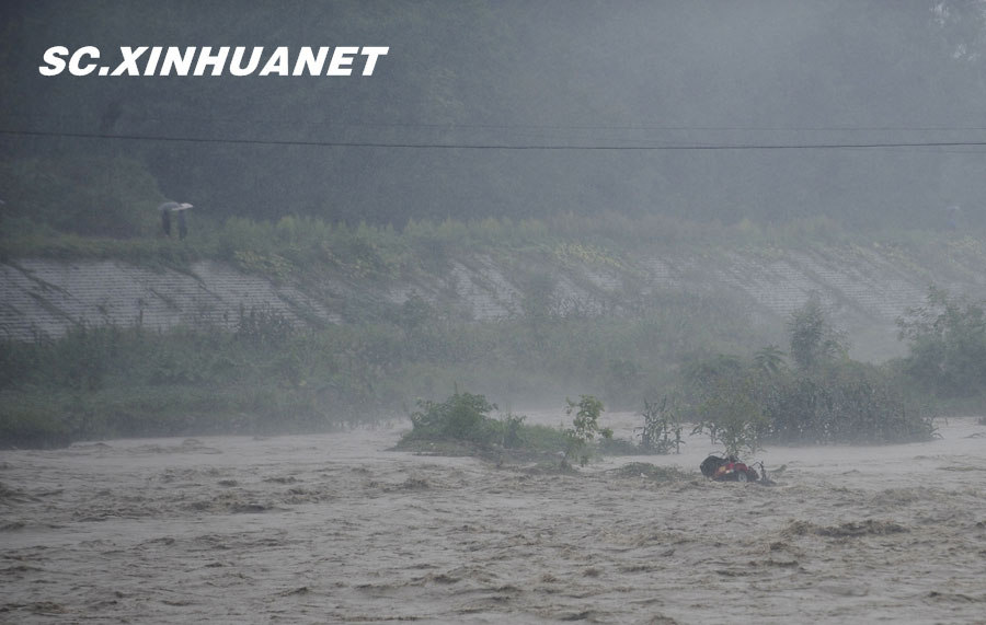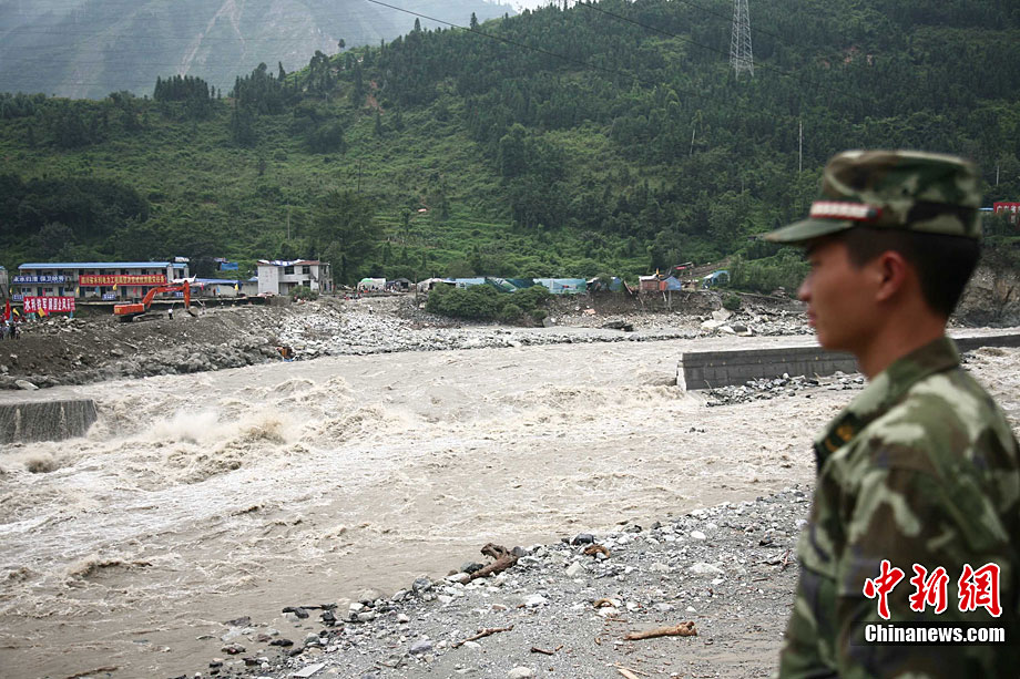 8月19日晚10時許,洪峰再次通過汶川縣映秀鎮,突如其來的洪峰沖垮了映秀鎮堰塞體旁的防護欄,造成該段岷江水位下降,湍急的水流轉向沖刷映秀鎮新城河堤,搶險隊已用裝有石料的鐵絲網圍住河堤以保護映秀鎮新城。圖為已沖毀的岷江防護欄。中新社發 張浪 攝