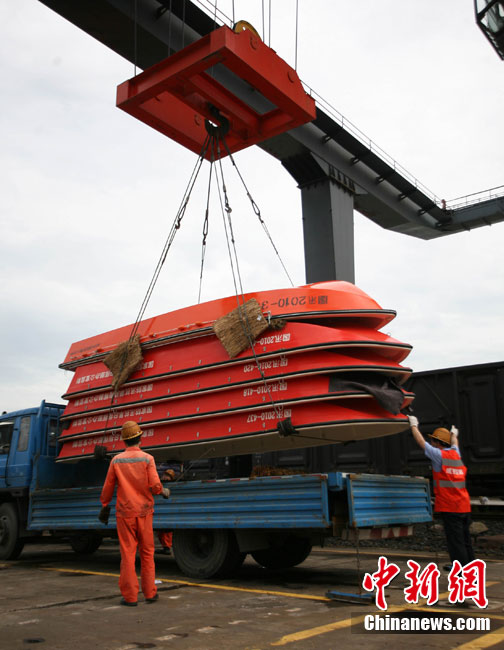 8月21日上午,國家防總緊急調撥的80艘沖鋒舟,40支橡皮舟、120臺船外機、1萬件救生衣、4000片鉛絲籠網片、4000個鋼絲網兜、500盞查險燈等搶險救災物資順利抵達成都火車東站,將立刻分發運往成都、眉山、樂山、巴中等災情嚴重地區。圖為裝卸工人正在吊裝沖鋒舟。中新社發 劉忠俊 攝