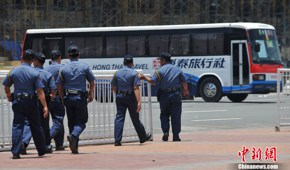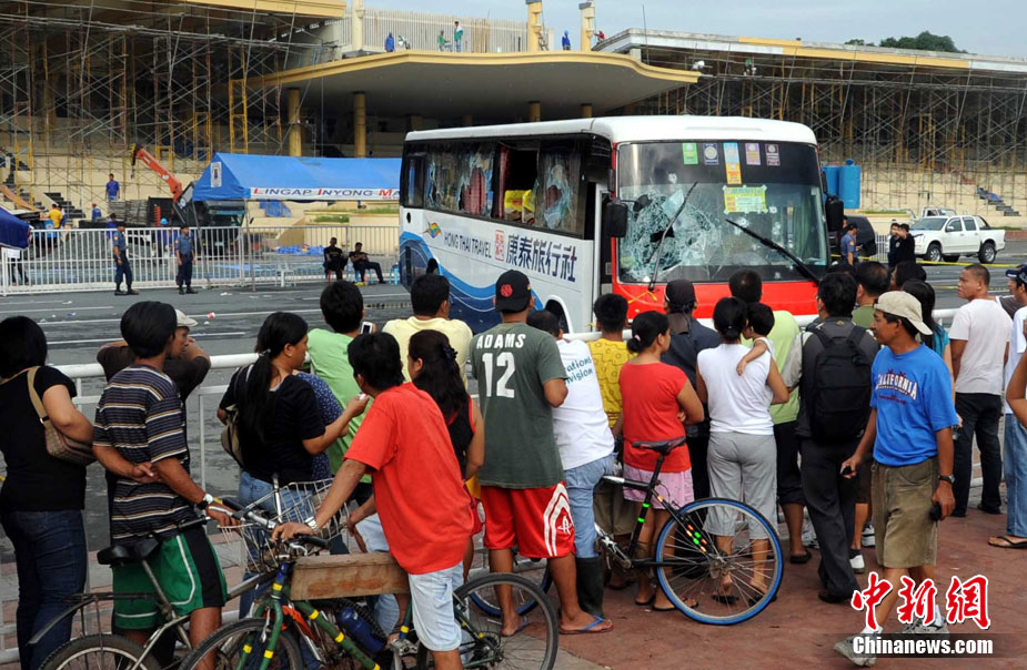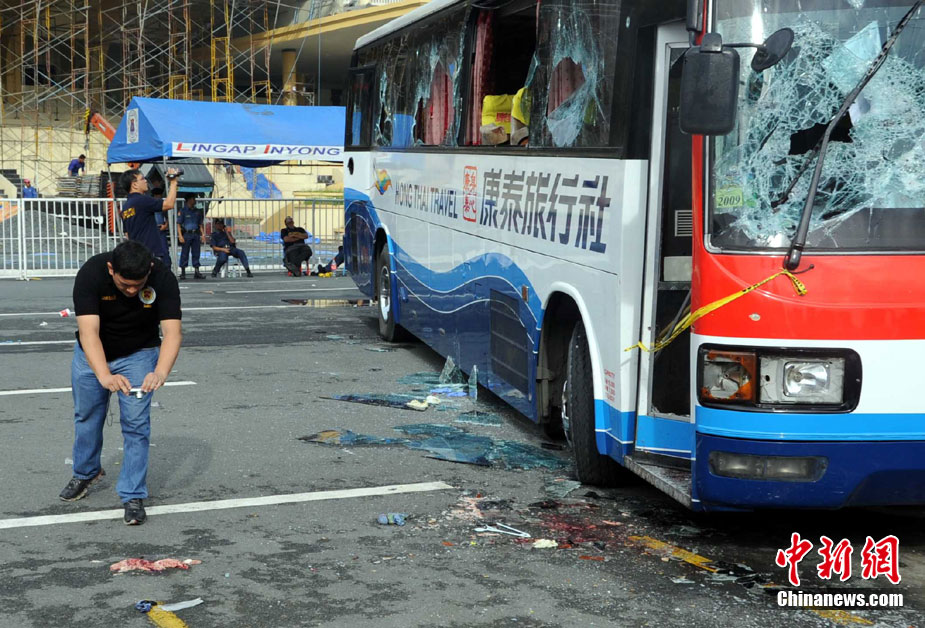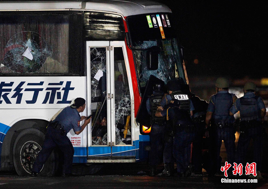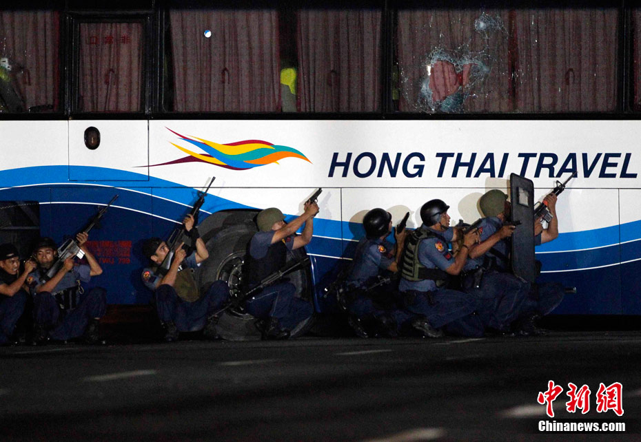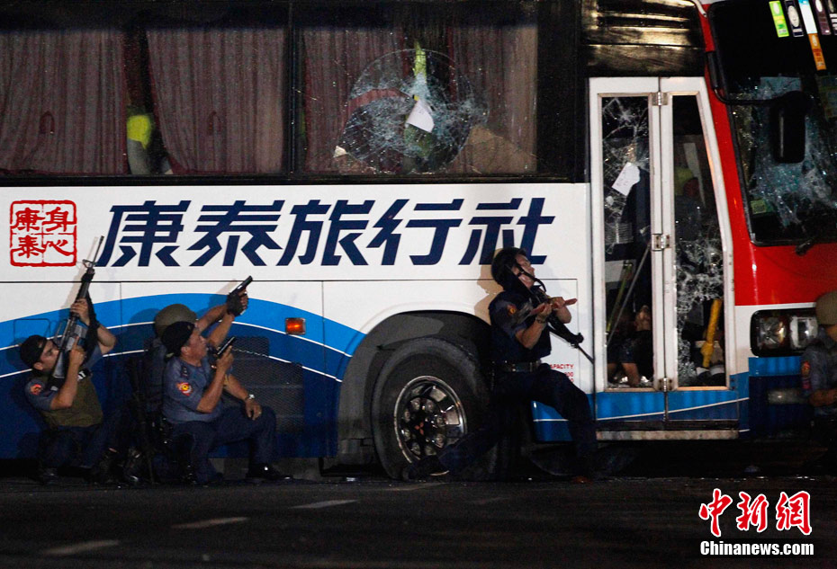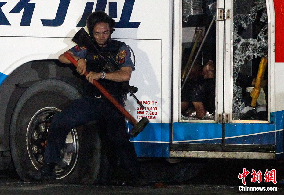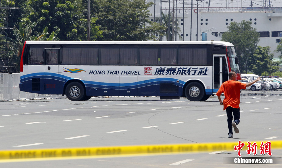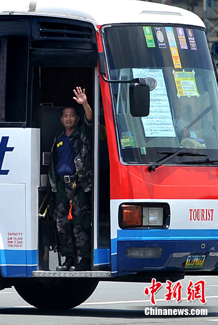香港康泰旅行社23日證實,一個21人的香港旅行團在菲律賓馬尼拉被劫持。旅行團包括20名香港游客和1名香港領隊,其中有3名兒童。劫持者是一位被革職的警察。截止目前已有6名人質獲釋,其中包括3名兒童。圖為劫持者站在被劫持的旅游觀光車門口。
