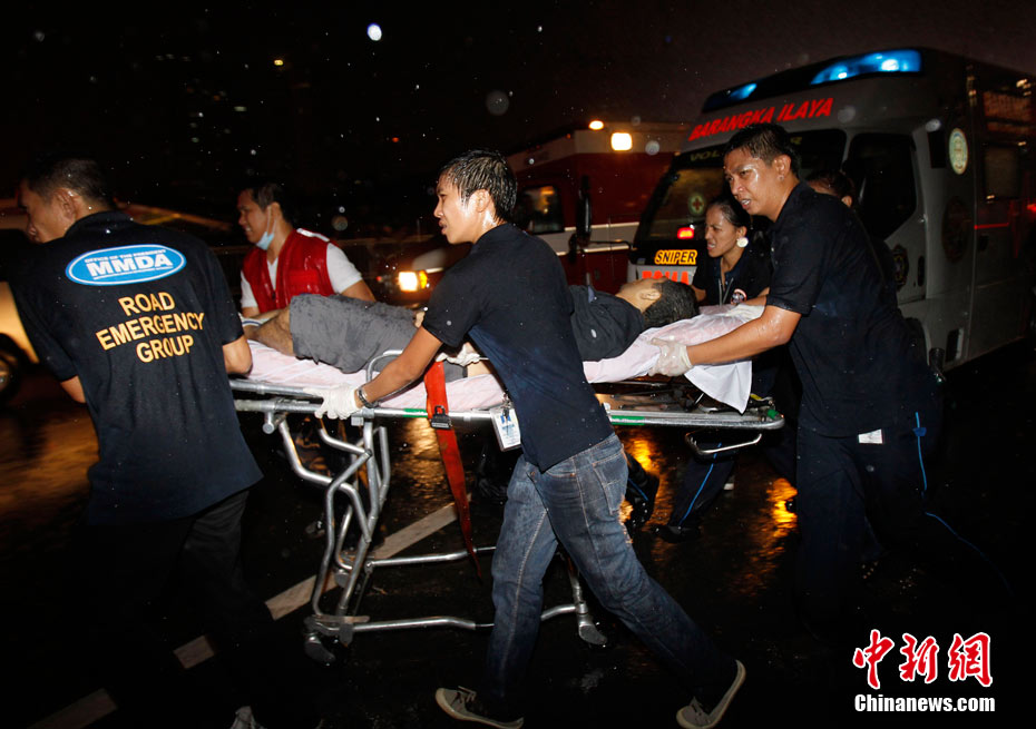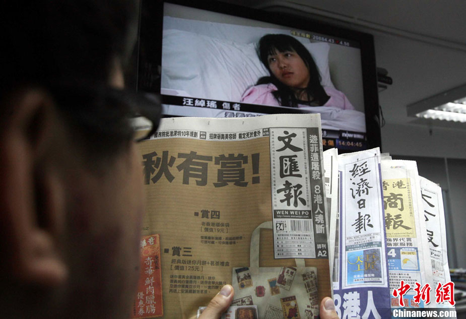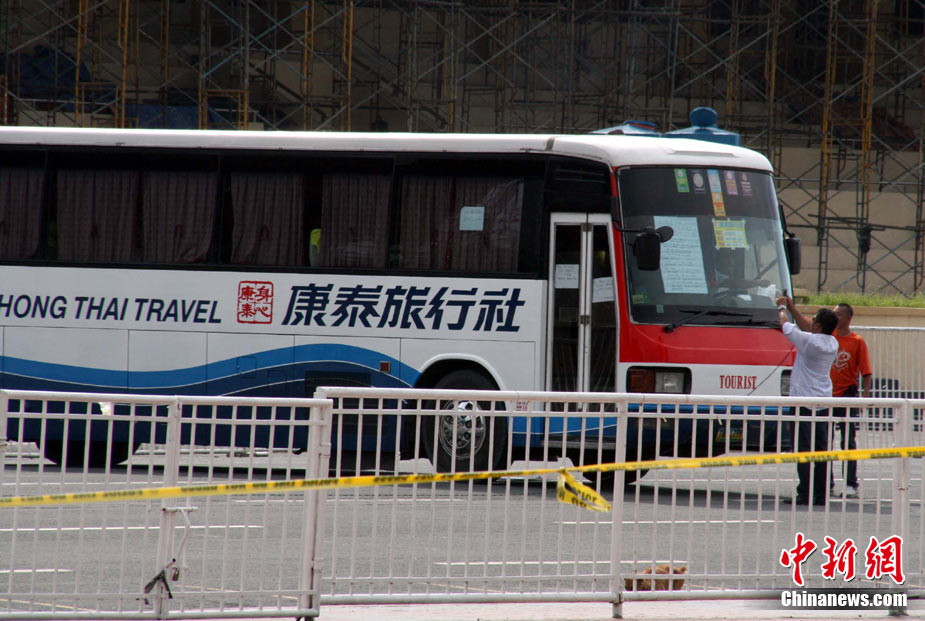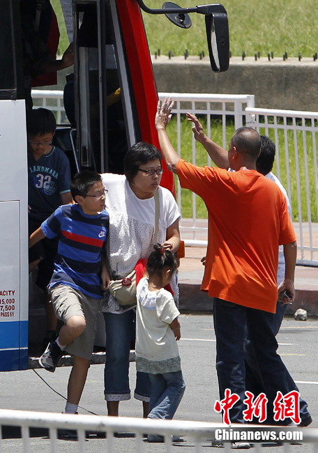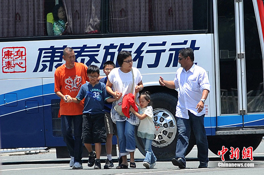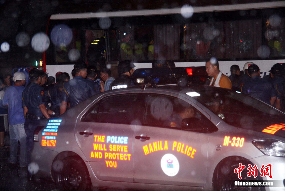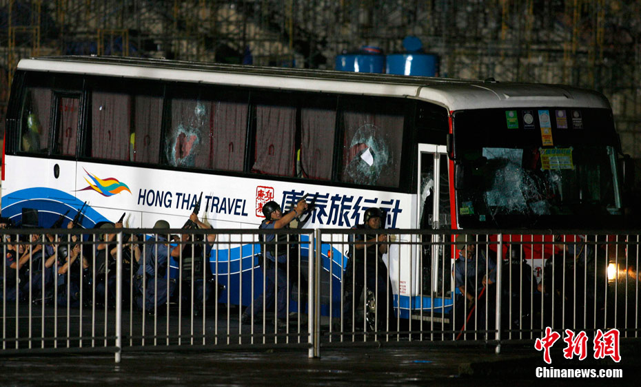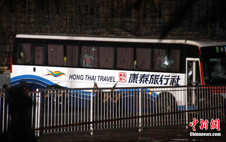 香港康泰旅行社23日證實,一個21人的香港旅行團在菲律賓馬尼拉被劫持。旅行團包括20名香港游客和1名香港領隊,其中有3名兒童。劫持者是一位被革職的警察。截止目前已有6名人質獲釋,其中包括3名兒童。圖為劫持者站在被劫持的旅游觀光車門口。