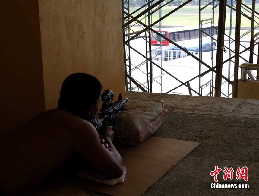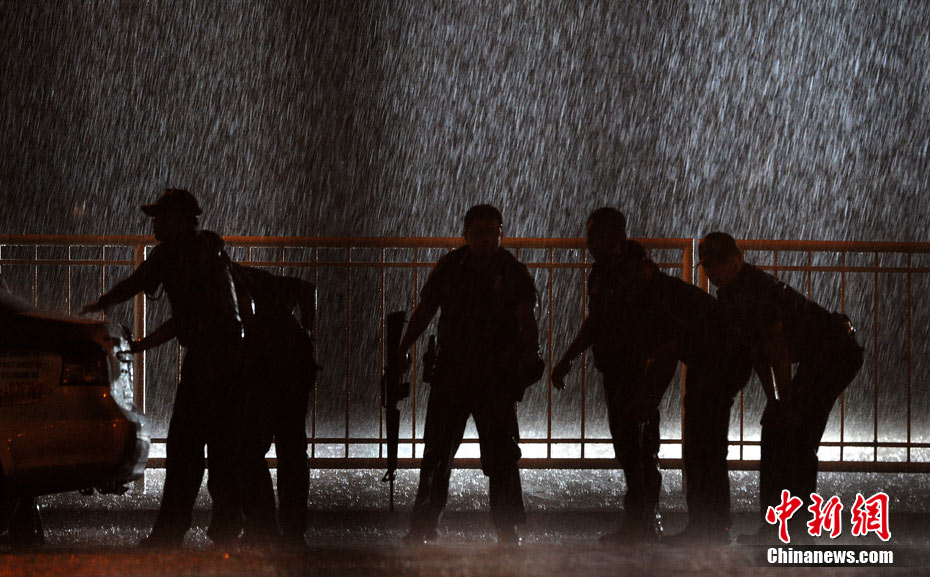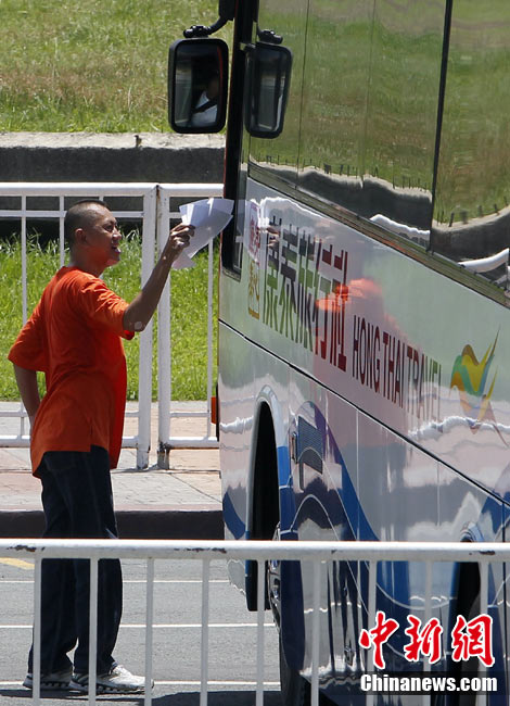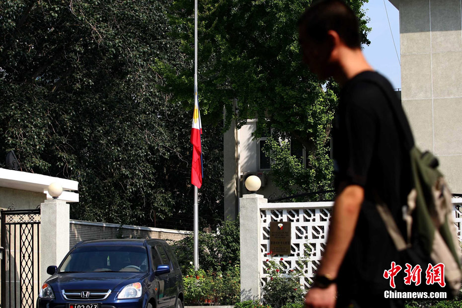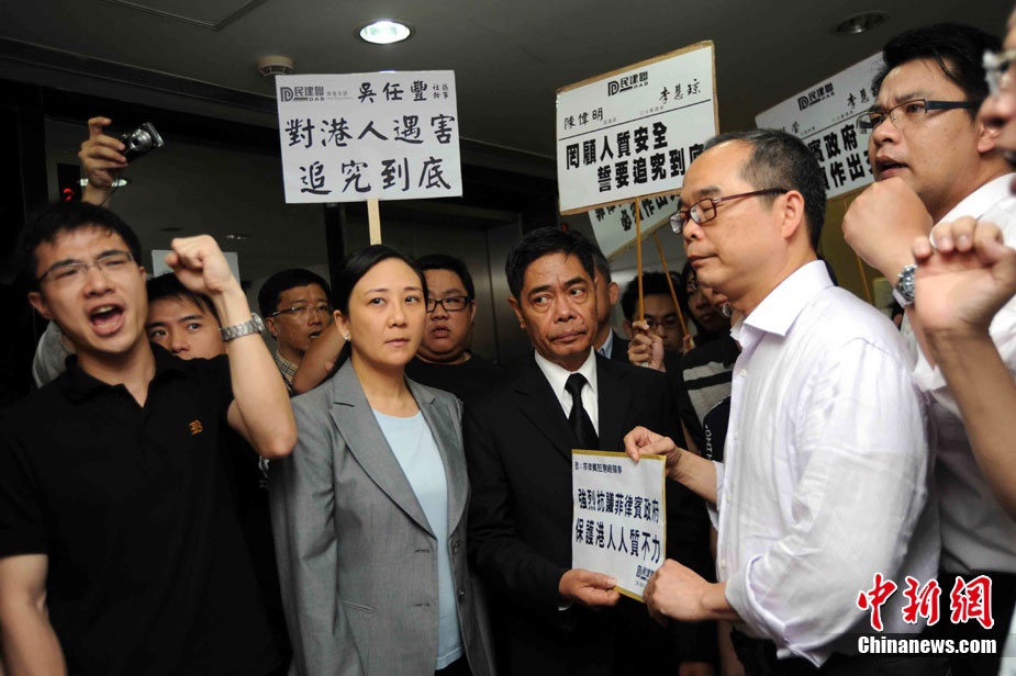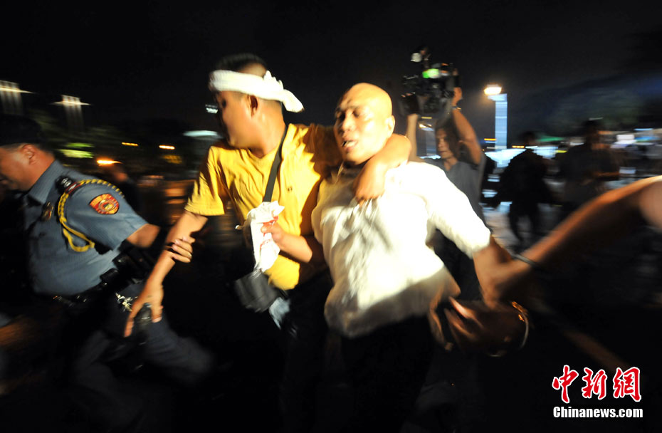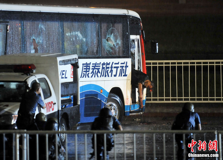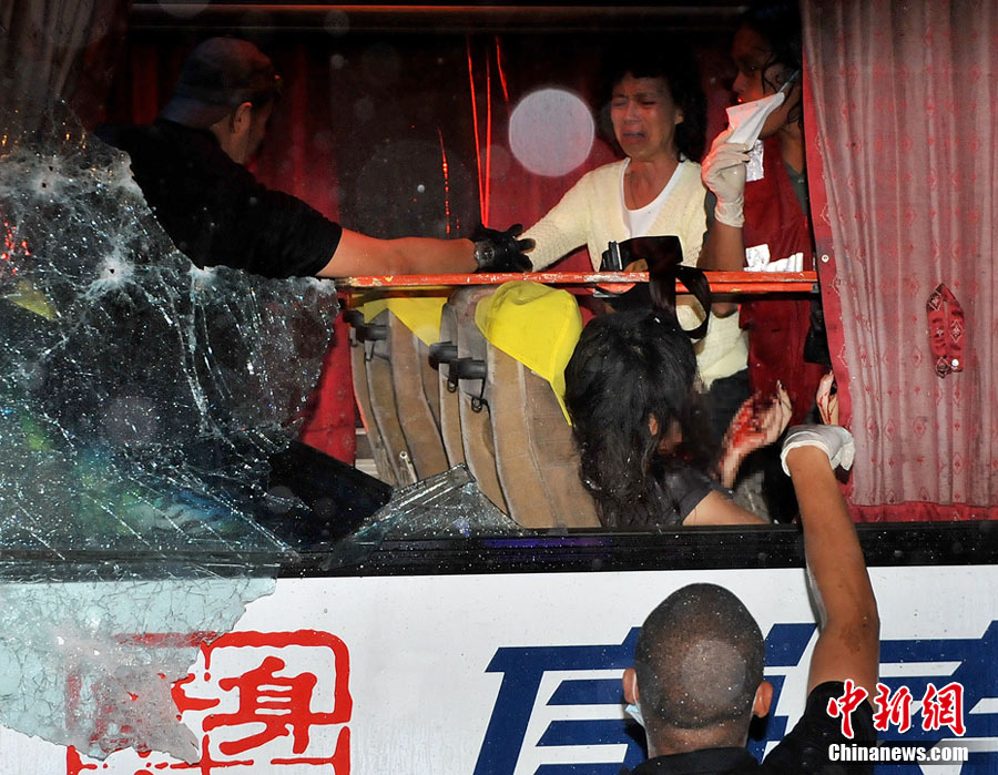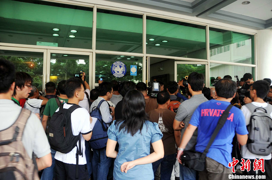 香港康泰旅行社23日證實,一個21人的香港旅行團在菲律賓馬尼拉被劫持。旅行團包括20名香港游客和1名香港領隊,其中有3名兒童。劫持者是一位被革職的警察。截止目前已有6名人質獲釋,其中包括3名兒童。圖為劫持者站在被劫持的旅游觀光車門口。