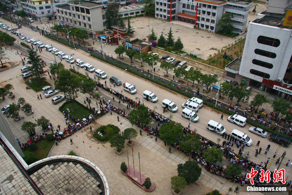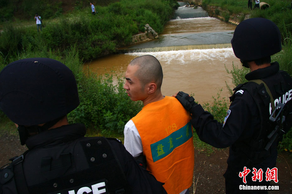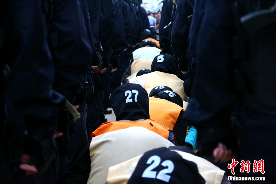 8月23日,昆明警方押解“洪興幫”黑惡勢力團伙21名主要犯罪嫌疑人指認現場。昆明警方連日來積極開展“嚴打整治行動”,于2010年5月成功搗毀長期在尋甸縣作惡的“洪興幫”黑惡勢力團伙,繳獲作案大型砍刀30余把,軍用子彈58發,防刺服2件以及20余部通訊設備。中新社發 任東 攝