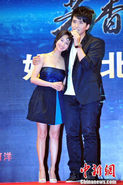 8月25日,電影《芳香之城傳奇》在北京舉行記者會。不老的“紫霞仙子”朱茵攜主演扎西頓珠、張達明、李子雄、張璇、董立范等亮相。朱茵以一襲抹胸短裙亮相,自曝在新片中大轉型,飾演一個有天然體香的神秘啞女,男主角扎西頓珠飾演的“富二代”被其吸引后,上演了一段純美姐弟戀。朱茵在接受采訪時坦言自己并不拒絕姐弟戀。圖為朱茵、扎西頓珠現場秀親昵。中新社記者 李學仕 攝