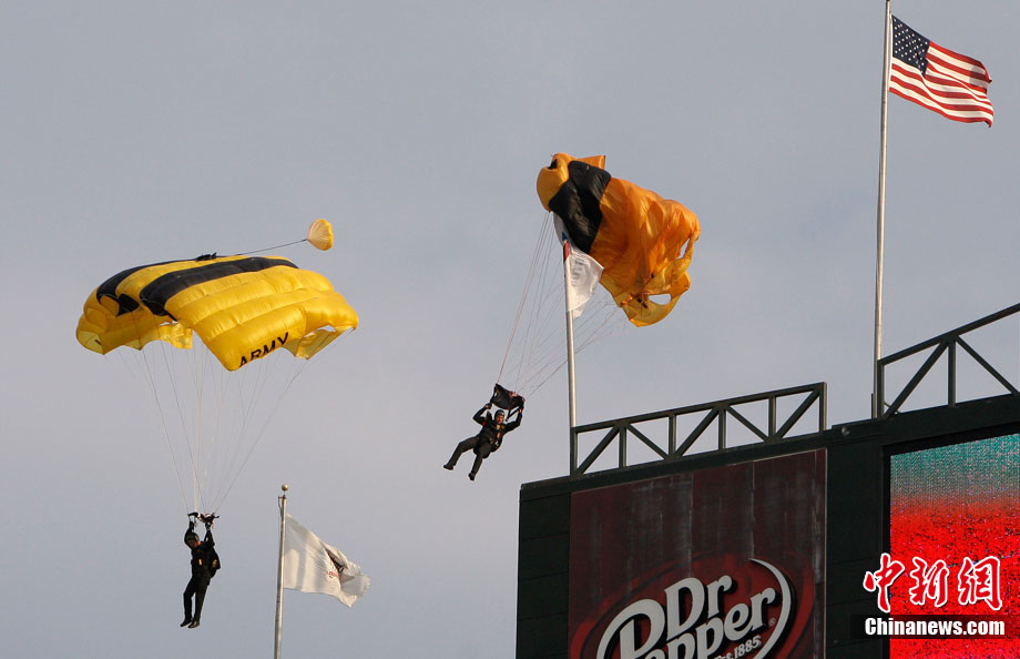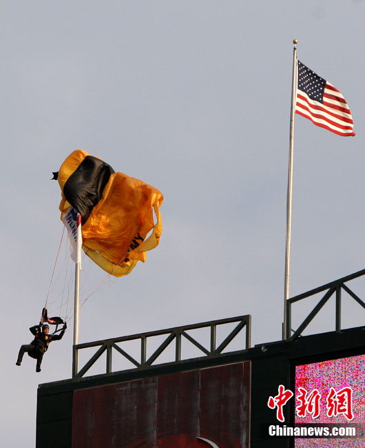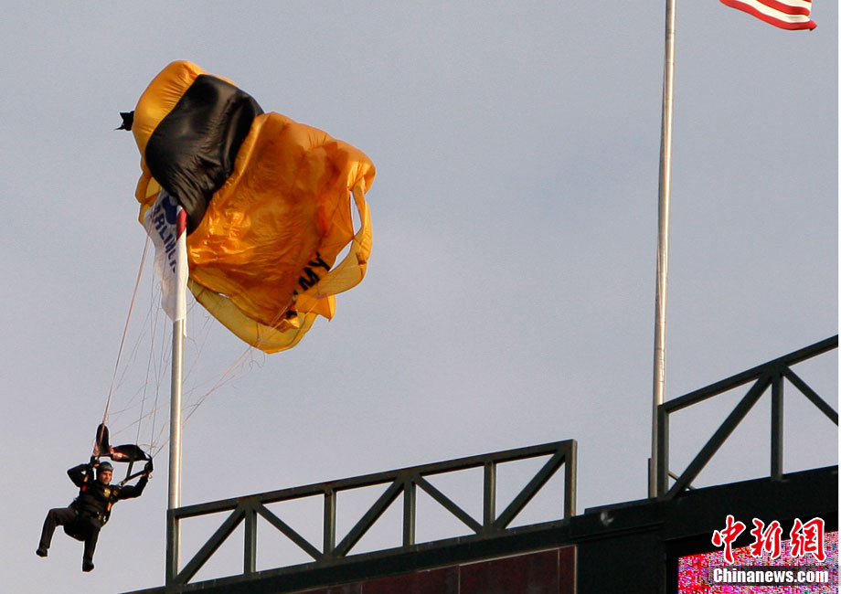 當地時間8月24日,一名美國陸軍的傘兵在美國德克薩斯州阿靈頓棒球比賽開始前的表演中不小心被棒球場旁的旗桿絆住降落傘,掛在了半空中。據悉,當時這名傘兵從德克薩斯州阿靈頓上空跳傘,原本預計著陸在一塊空地,結果降落傘被棒球場邊的旗桿勾到,被掛在了旗桿上。隨后他在球場工作人員的幫助下獲救。