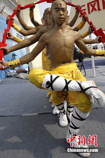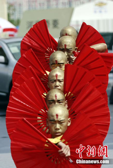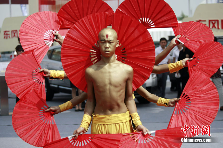 8月27日,河南鄭州一車展上,一群“和尚”模樣的功夫小子們舞出羅漢功夫扇客串車模來吸引參觀者的眼球。據該參展企業介紹,這種別出心裁的做法往往能令參觀者耳目一新,更能吸引消費者眼球。中新社記者 王中舉 攝