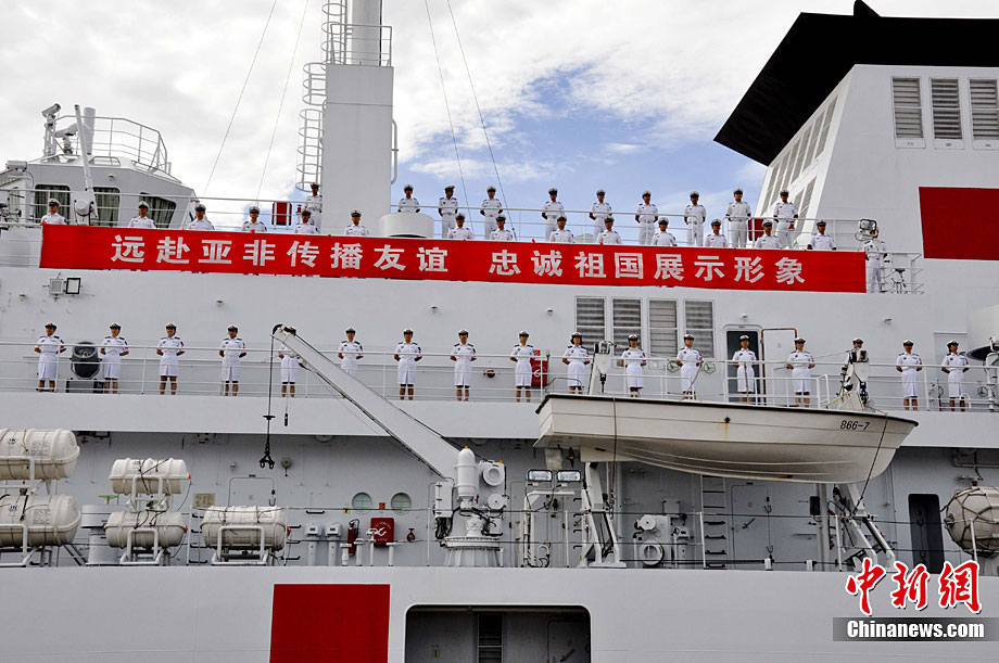 8月31日,經中央軍委批準,由中國自行研制的世界首艘萬噸級“和平方舟”號醫院船從舟山某軍港啟航,前往亞丁灣海域及吉布提、肯尼亞、坦桑尼亞、塞舌爾、孟加拉五國執行“和諧使命——2010”任務。這是中國“和平方舟”號醫院船首次赴國外執行巡診及醫療服務任務。圖片來源:cnsphoto 胡善敏 攝