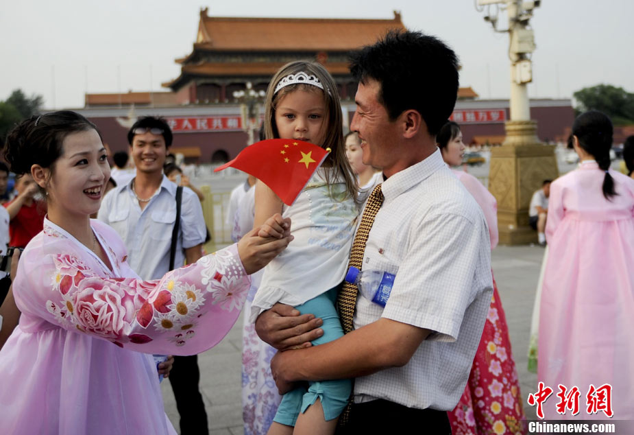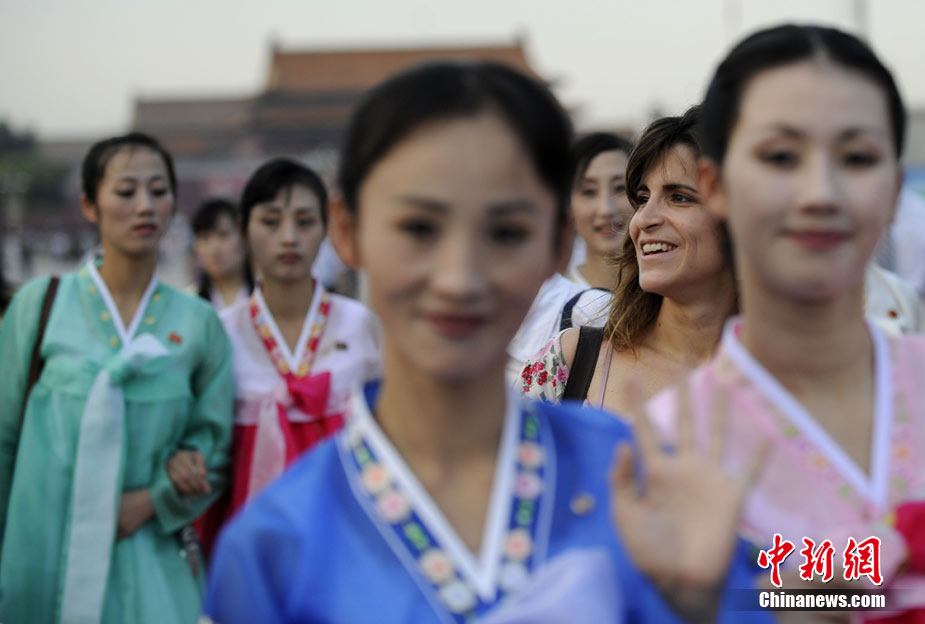 9月1日,朝鮮平壤藝術團的藝術家參觀天安門廣場。當日,朝鮮平壤藝術團在中國全國的巡演活動正式啟動,平壤藝術團將在上海世博、寧波、廣州、深圳、珠海、昆明、重慶、武漢等20多個城市巡演“怒放的金達萊”。中新社記者 廖攀 攝