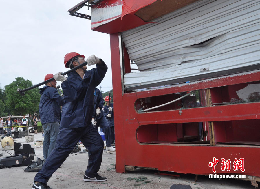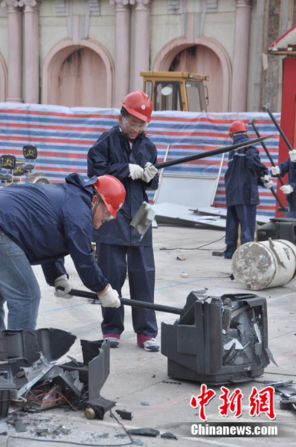 9月4日,一群全副武裝、手持鐵錘的都市人在長沙世界之窗內廣場上瘋狂錘砸廢舊小鐵屋,以此宣泄心中的壓力。據悉,為幫助都市人群釋放因工作、生活帶來的壓力和郁悶,長沙世界之窗從當日開始舉行為期一個月的減壓節。主辦方將收集來的摩托車、小車、電視機、洗衣機等廢舊設備擺放在預設的場地內,每天召集數十名游客參與其中。 中新社記者 肖前輝 攝