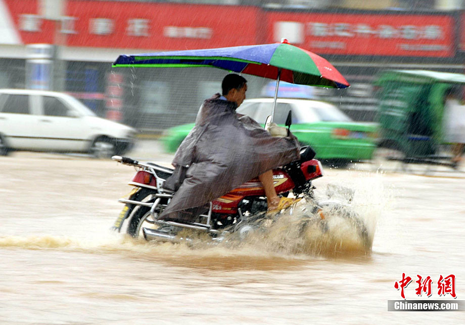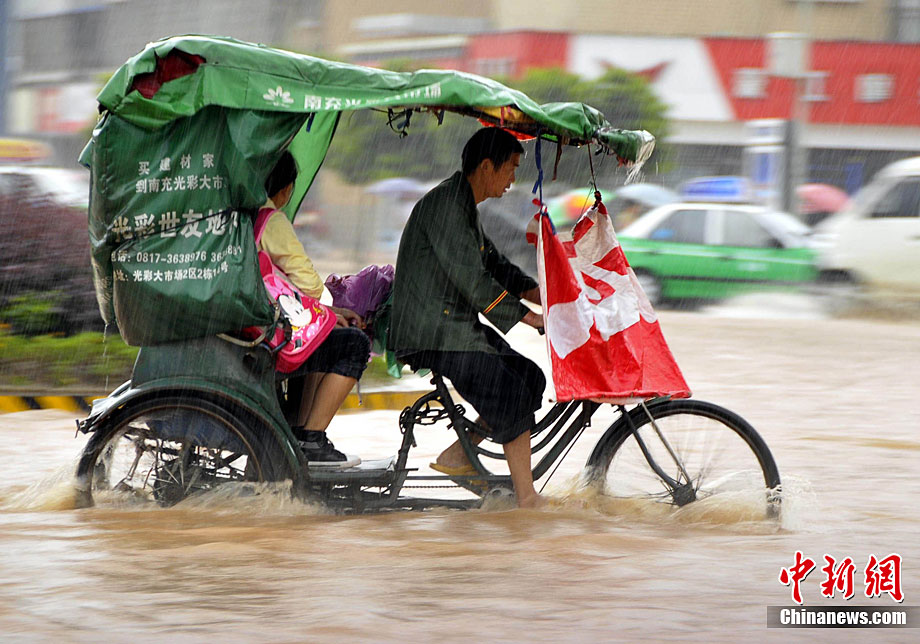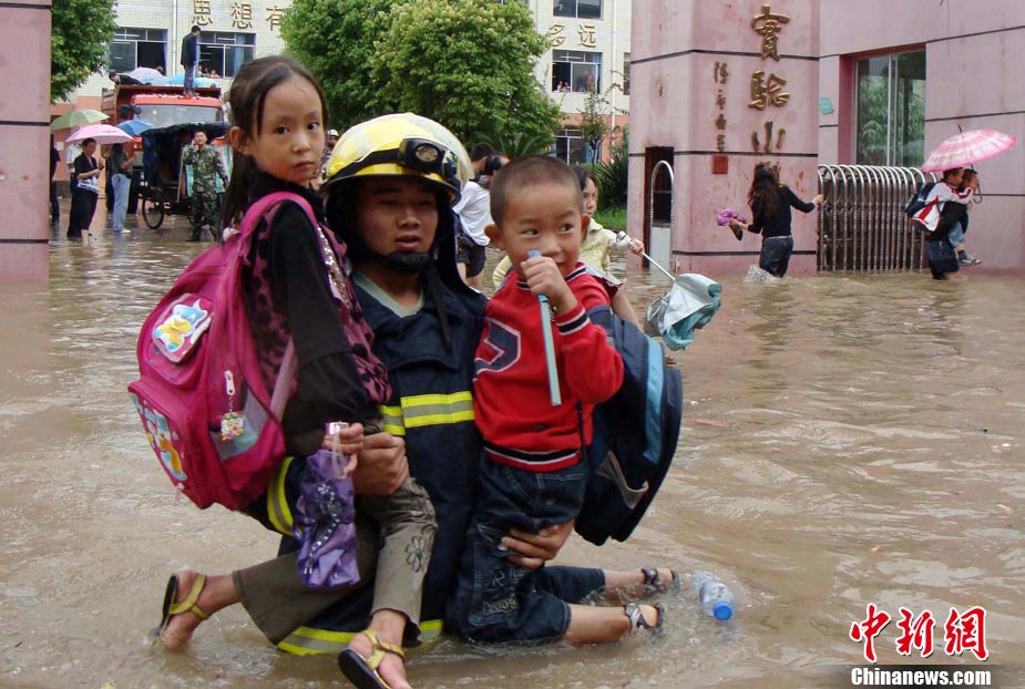 9月9日,四川省南充市突降暴雨,造成該市的高坪、嘉陵、順慶等主城區部分低洼地帶積水嚴重。高坪區第八小學、第六小學,嘉陵區光彩實驗小學被洪水圍困,南充消防官兵緊急出動,及時將被洪水圍困900多名小學生轉移至安全地帶。圖為消防、老師正在轉移受困學生。中新社發 南消萱 攝