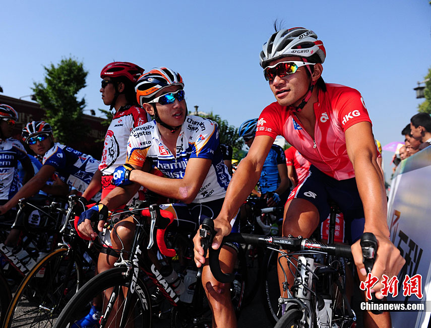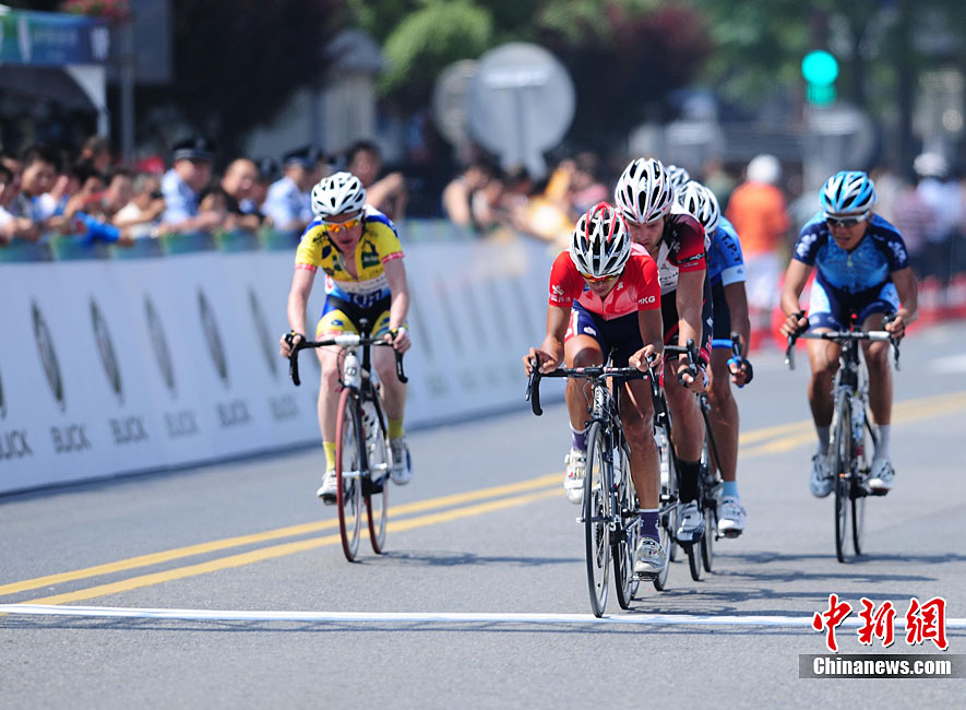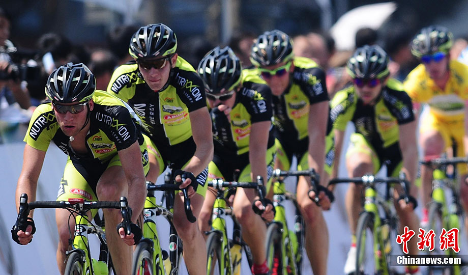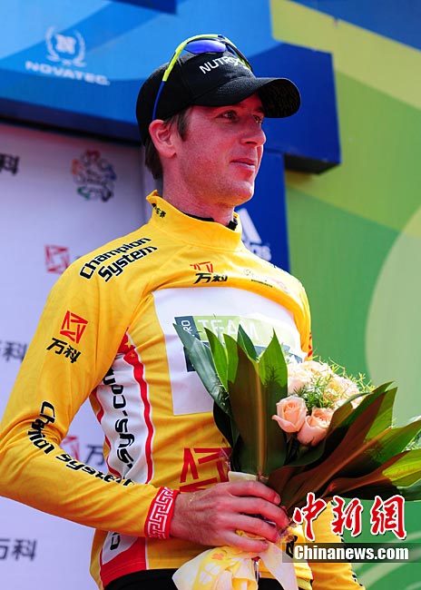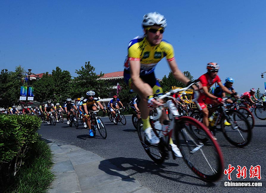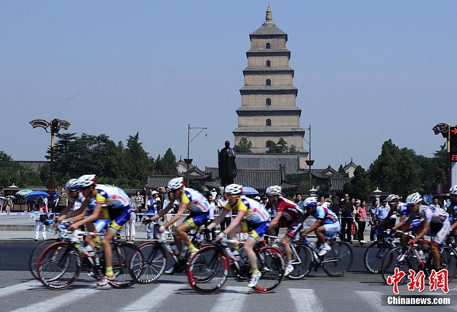 9月10日上午,首屆環中國國際公路自行車賽序幕賽(個人計時賽)在西安市曲江池畔舉行,結果德國紐特里什車隊的車手德克·穆勒(中)獲得本賽段冠軍,奪得本次比賽的首件黃色領騎衫。中新社記者 侯宇 攝