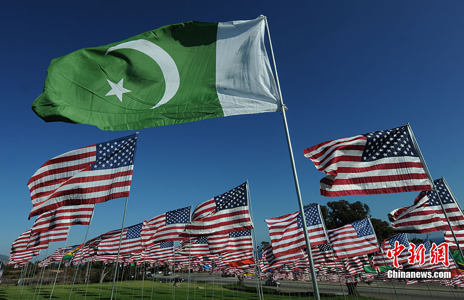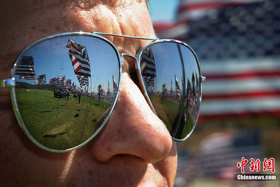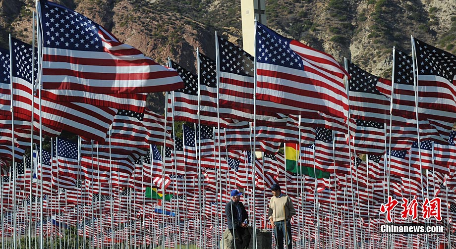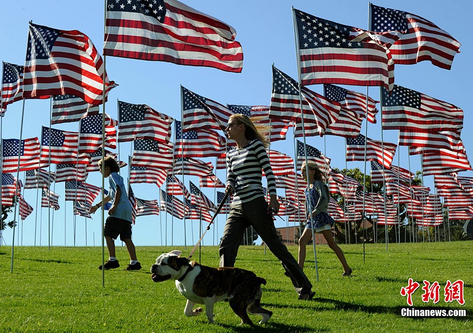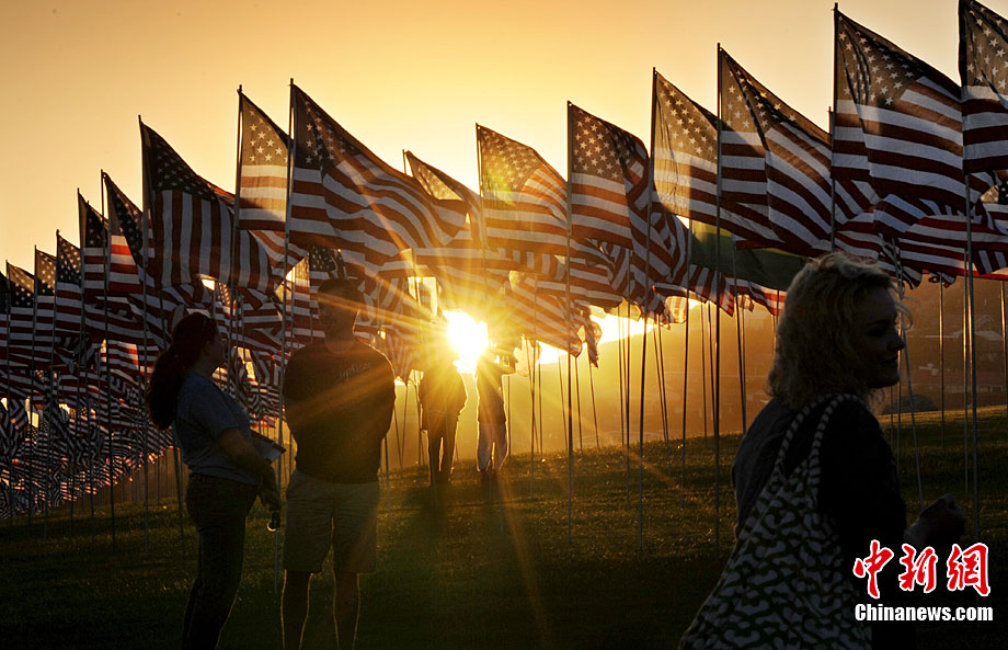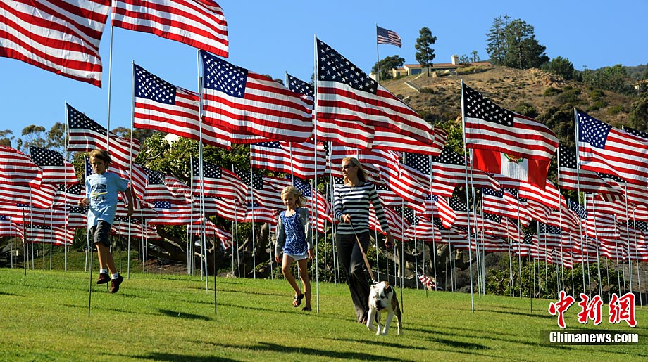 當地時間9月10日,在美國加利福尼亞州的馬里布,一些大學生在馬里布佩珀代恩大學的草坪上插上近3000面美國國旗和其它國家和地區的旗幟,紀念“9·11”恐怖襲擊事件的遇難者。