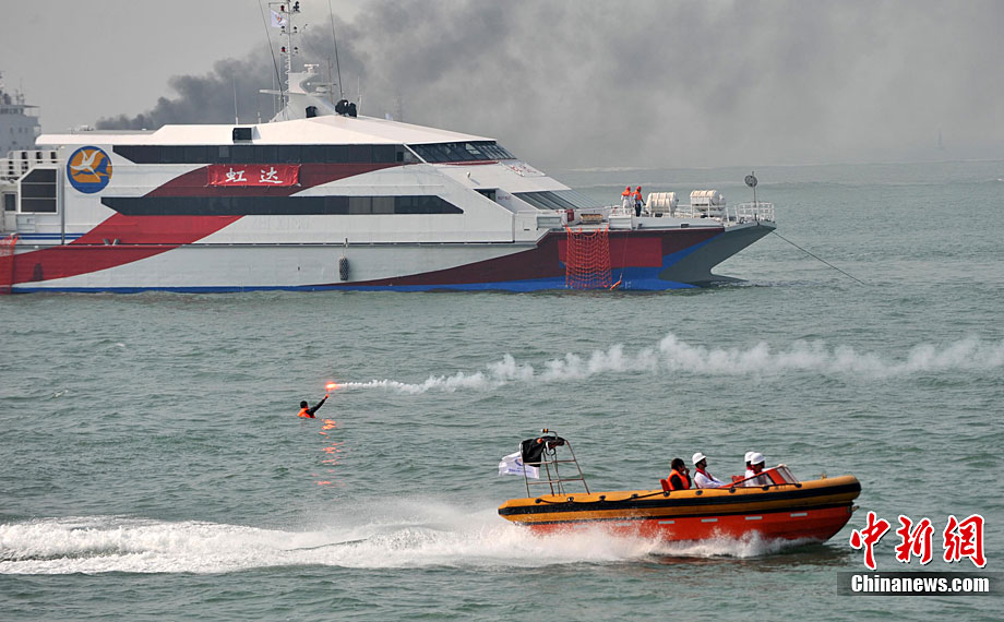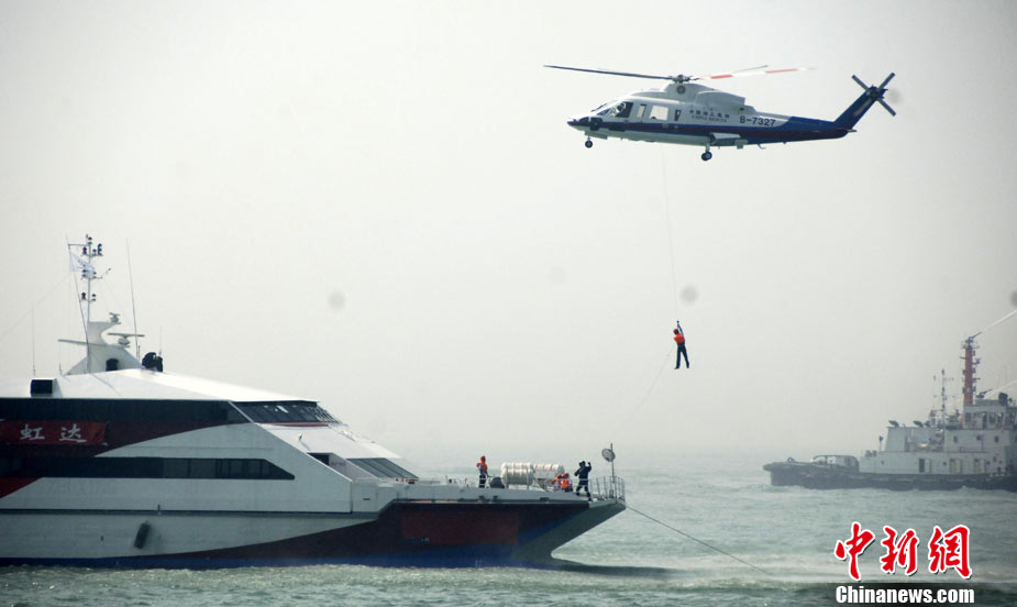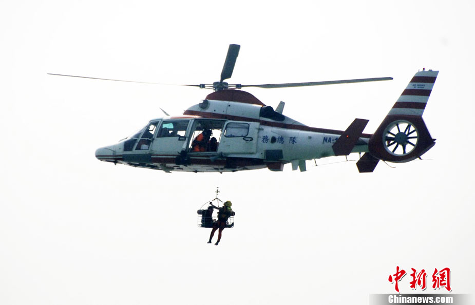 9月16日上午,2010年海峽兩岸海上聯合搜救演練在臺灣海峽的廈門、金門附近海域舉行。海峽兩岸海上搜救單位參演人數400多人,共動用搜救船舶14艘、救助飛機3架。其中大陸方面主要參演船舶9艘、救助直升機2架;臺灣方面主要參演船舶5艘、救助直升機1架。這是自2008年12月15日兩岸海上直航正式啟動以來,海峽兩岸海上搜救力量首次共同進行的大規模海陸空聯合搜救演練。圖為演練現場。中新社發 王東明 攝