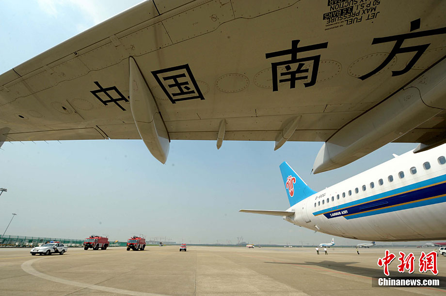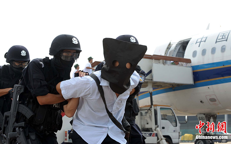 9月16日,深圳寶安國際機場舉行反恐應急演習,模擬一架客機被歹徒劫持后,特警、防爆、消防、醫療救護等各方面展開營救,在短時間內解救人質處理事故。中新社記者 陳文 攝