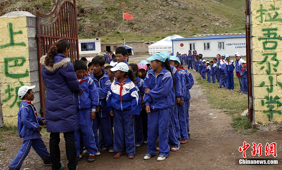 時逢中秋佳節(jié)到來之際,經(jīng)歷了地震5個月后的中國青海玉樹災區(qū)正在加緊重建家園。如今,玉樹街頭臨時搭建的貨店及百貨商店里各種日用品琳瑯滿目,菜市場新鮮的蔬菜和水果供應充足,幾家重新開業(yè)的飯館生意興隆。圖為在當?shù)匦W,學生們在重建的教室里上課。中新社記者 錢興強 攝