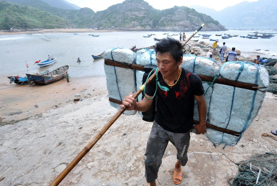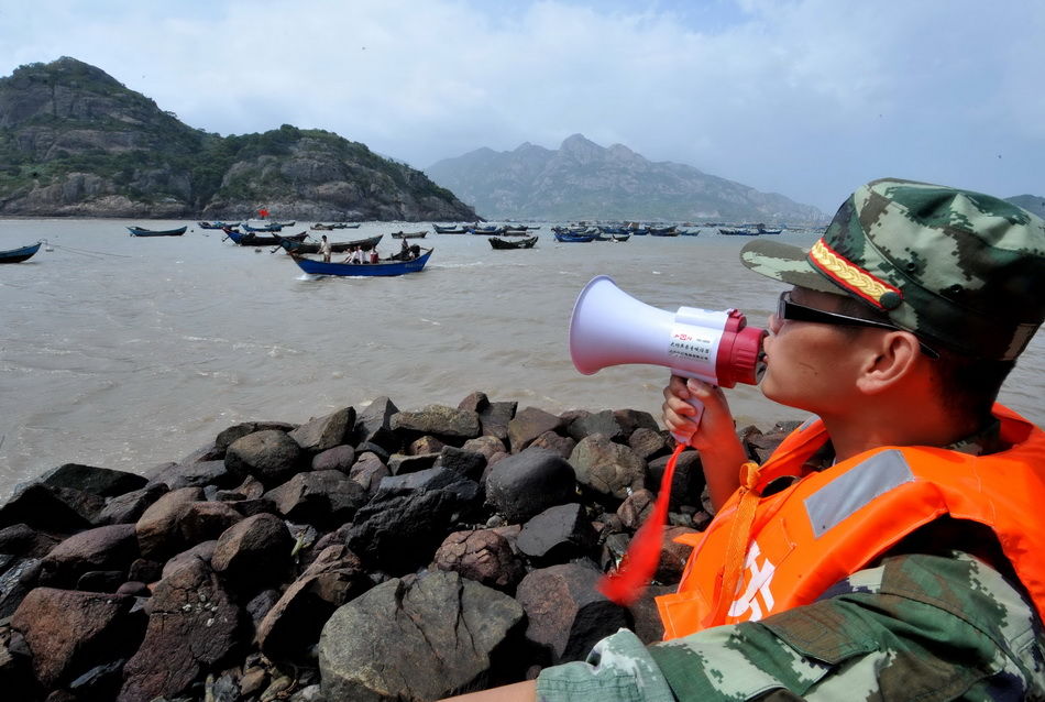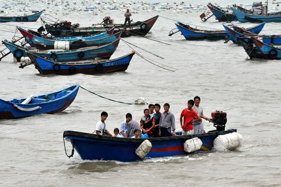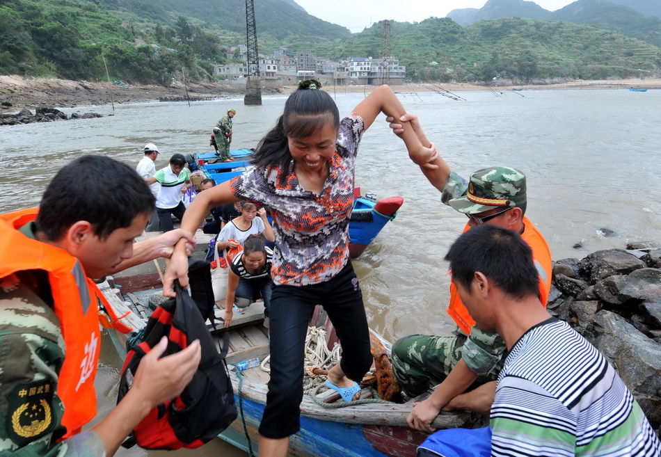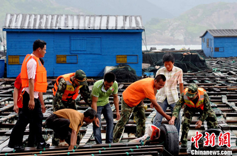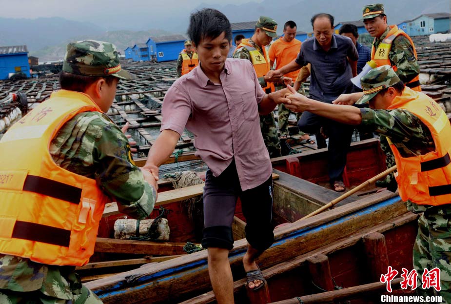 9月20日7時,今年第11號臺風“凡亞比”在福建省漳浦縣沿海登陸。圖為9月19日傍晚,福州連江縣邊防官兵冒著大風幫助漁排養殖人員加固漁排并緊急轉移該縣可門海上養殖區內漁排養殖人員。劉可耕 攝