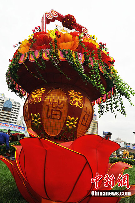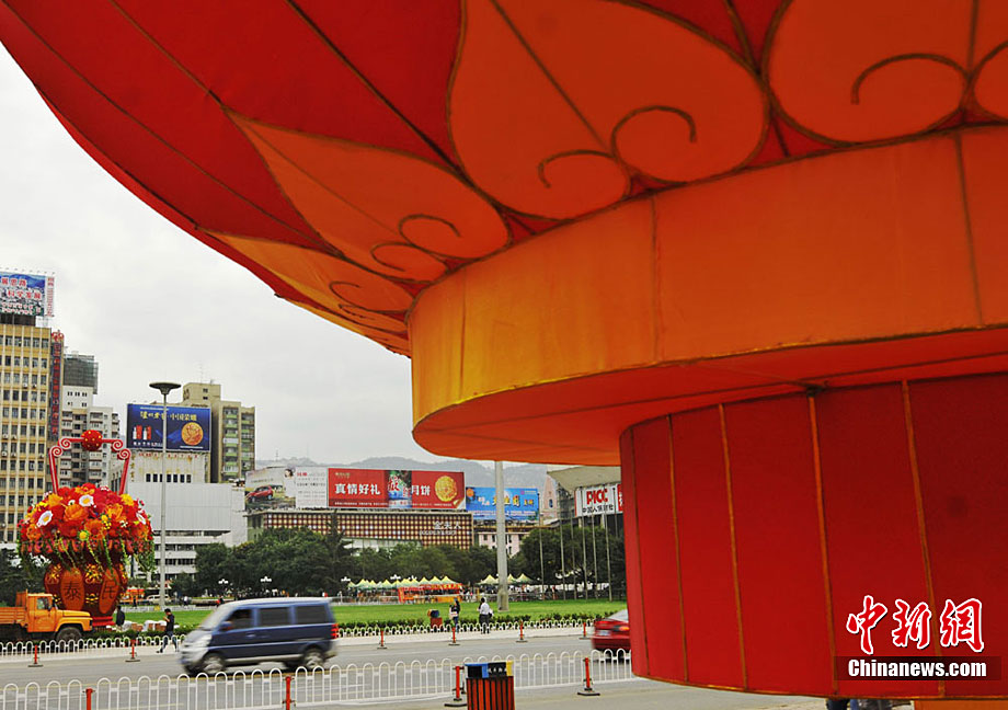 9月20日,中秋、國慶雙節即將到來,蘭州東方紅廣場布置一新,花籃上標注有“和諧社會”與“國泰民安”。 楊艷敏 攝