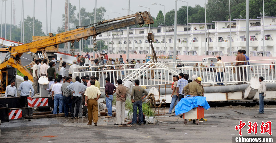 9月21日,印度首都新德里一座正在建造中的過街天橋下午突然坍塌,造成至少26名施工工人受傷,其中5人傷勢嚴重。 印度安全人員和施工工人聚集在倒塌的天橋旁查看情況。