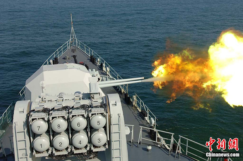 9月23日,中澳兩國海軍在中國黃海海域舉行聯(lián)合實彈軍事演練,此次演練的主要科目有編隊通信、海上聯(lián)合搜救、編隊運動、火炮對海射擊等內(nèi)容。圖為中國軍艦火炮對海上目標(biāo)實彈射擊。中新社發(fā) 王松岐 攝