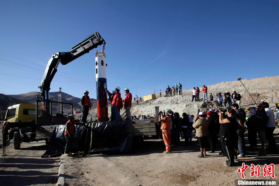 被困礦工的家屬在現(xiàn)場(chǎng)第一時(shí)間見到了救生艙,他們高興的鼓起掌來(lái)。這個(gè)救生艙重約420公斤,被命名為“鳳凰艙”,寓意著礦工們將依靠它重獲新生。救生艙身被涂成紅白藍(lán)3種顏色,這是智利國(guó)旗的顏色。艙內(nèi)高度為1.9米。另?yè)?jù)悉,這個(gè)子彈形的救生艙還備有氧氣瓶、逃生裝置和通訊設(shè)備等。