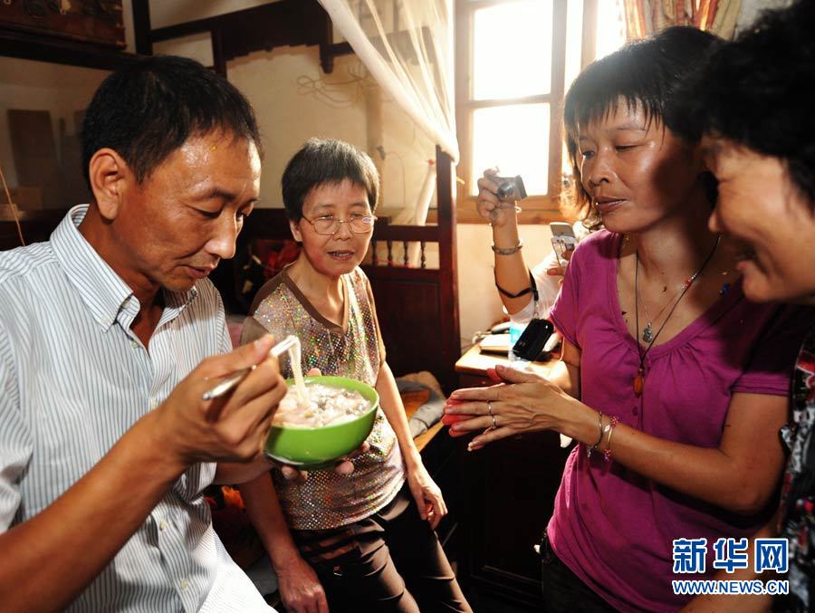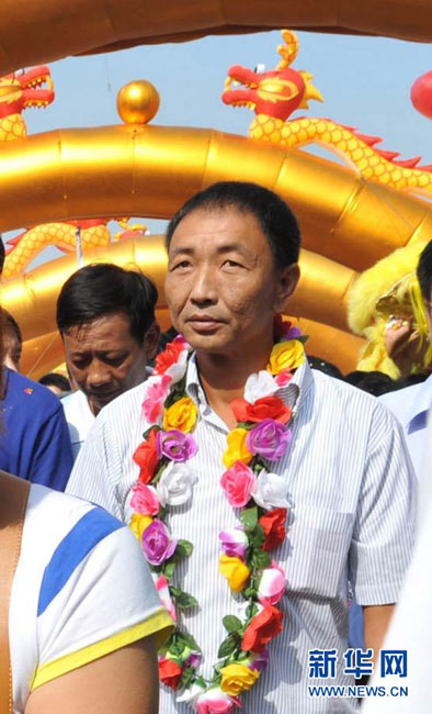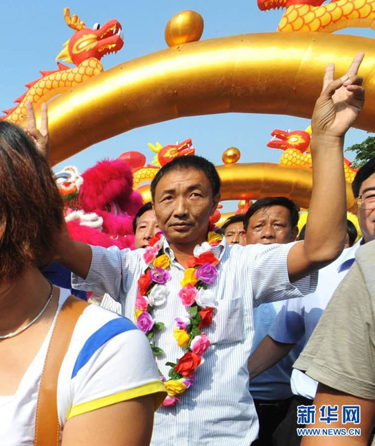 9月27日,被日方非法抓扣的中國漁船船長詹其雄返回家鄉--福建晉江市深滬鎮港滬村。當地鄉親熱情迎接他歸來。圖為詹其雄(圖中)下車后笑容滿面,受到了當地民眾的熱烈歡迎。中新社發 孫虹 攝