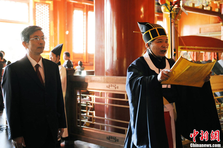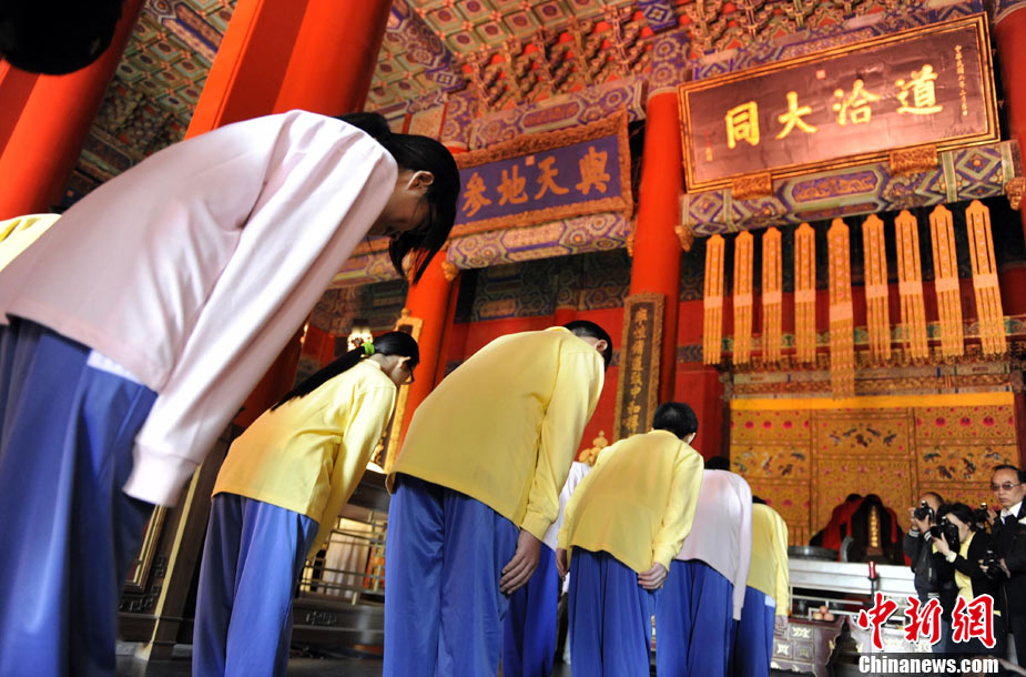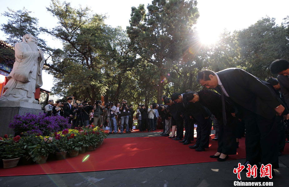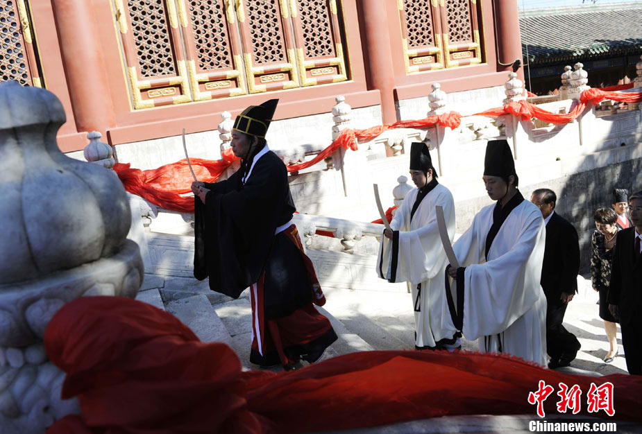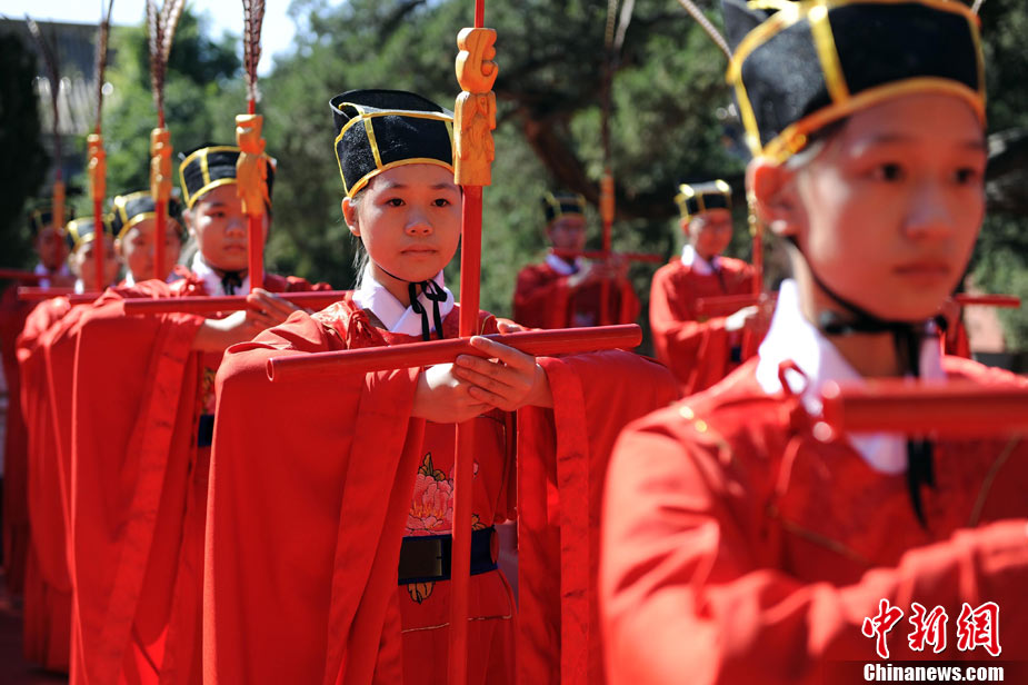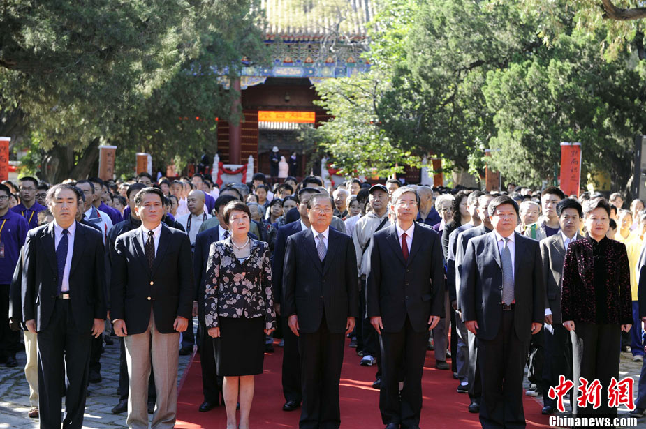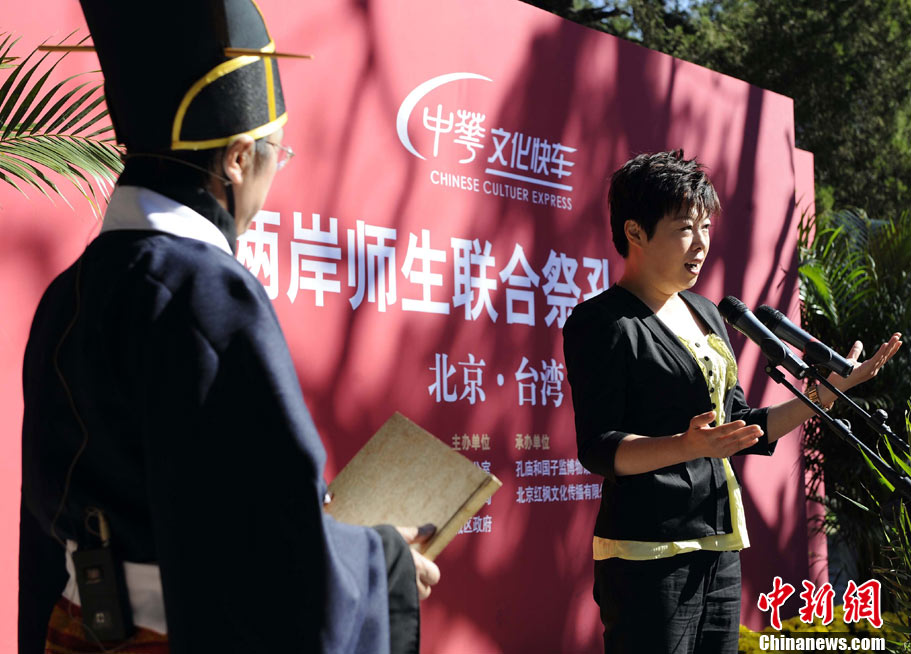 9月28日上午,兩岸師生聯合祭孔大典儀式在北京孔廟舉行。來自臺灣和北京的兩岸師生共計500人,共同祭奠孔子,弘揚中華傳統文化。中新社記者 劉震 攝