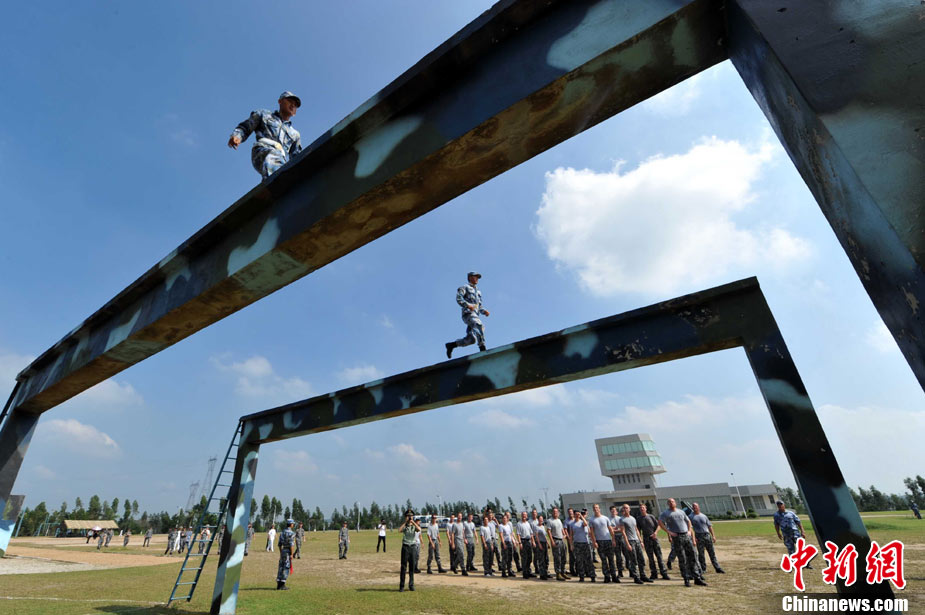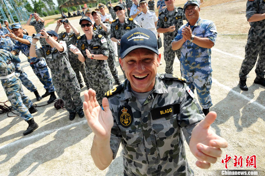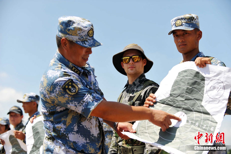 9月29日,中國南海艦隊某陸戰隊與應邀來華訪問的澳大利亞海軍陸戰隊在湛江某部訓練場舉行聯合訓練,包括攀登、兩棲障礙、射擊等。中新社記者 陳文 攝