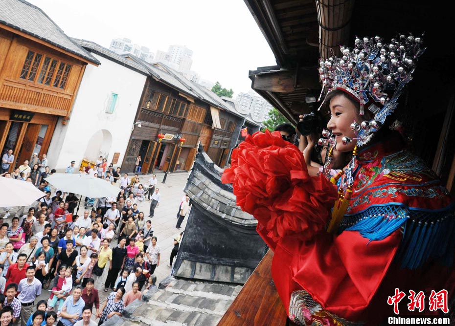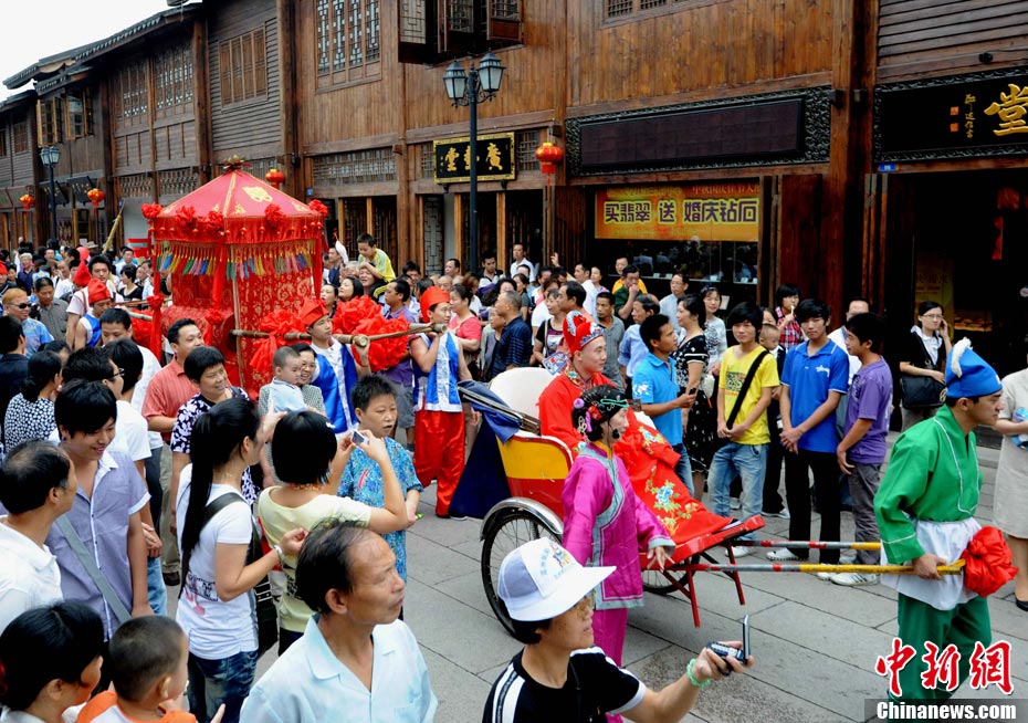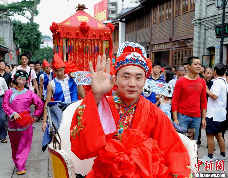 10月1日國慶節(jié),福州古街上演一場傳統(tǒng)民俗婚禮令眾多游客爭睹。該傳統(tǒng)民俗婚禮分起轎、回車馬、迎轎、下轎、祭拜天地、入洞房等場面喜慶。