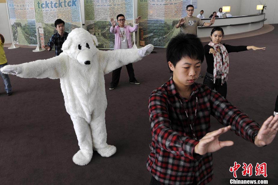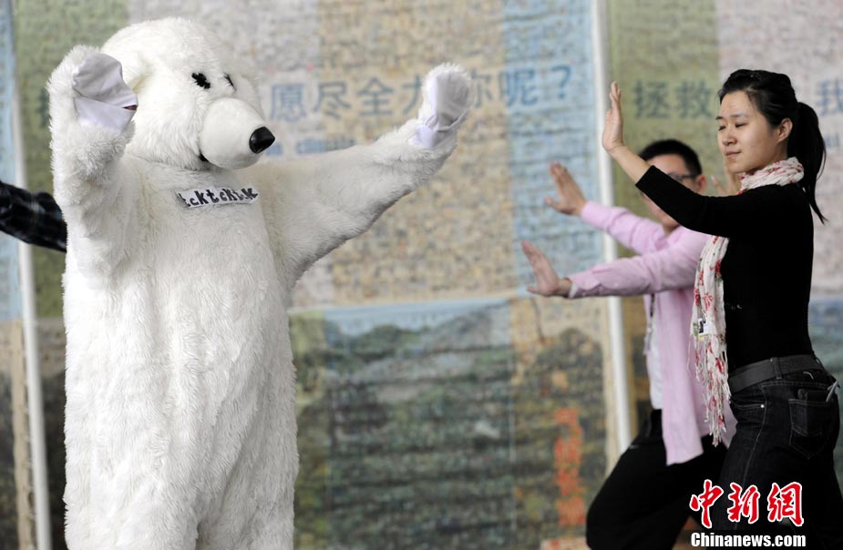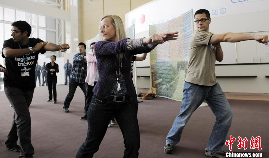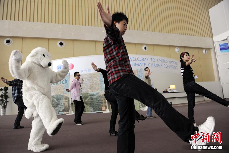 10月6日,聯(lián)合國(guó)氣候變化國(guó)際談判天津會(huì)議繼續(xù)舉行。全球氣候行動(dòng)聯(lián)盟(TckTckTck 運(yùn)動(dòng))特意安排了一個(gè)“北極熊”打太極的活動(dòng),邀請(qǐng)各國(guó)代表進(jìn)入會(huì)場(chǎng)之前加入打太極拳。希望這兩天談判各方達(dá)成一個(gè) “balanced package"(顧及各方利益的均衡協(xié)議),并以此警示人們愛(ài)護(hù)環(huán)境,拯救地球氣候。該組織由200個(gè)來(lái)自中國(guó)以及世界其他國(guó)家民間組織組成。 中新社記者 劉震 攝