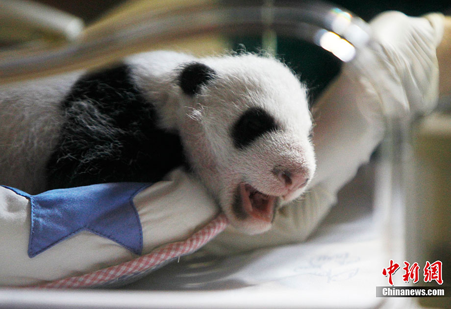當(dāng)?shù)貢r間10月8日,西班牙馬德里動物園出生的兩只人工受精的大熊貓幼崽第一次向媒體亮相。這對雙胞胎均為雄性,9月7日出生時他們的體重只有5盎司(141.5克)。經(jīng)過不斷的護(hù)理,它們現(xiàn)在體重已超過1公斤,并可以向媒體亮相了。