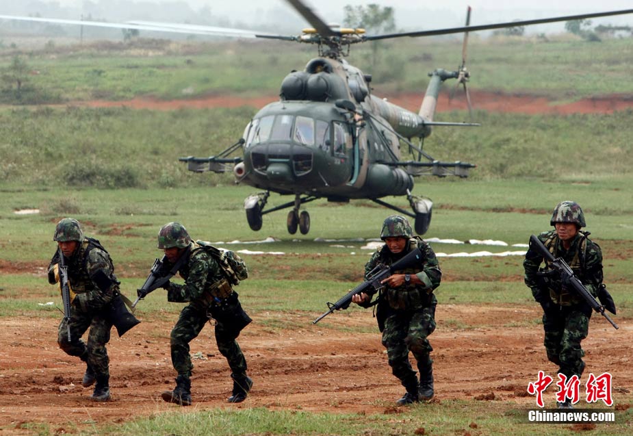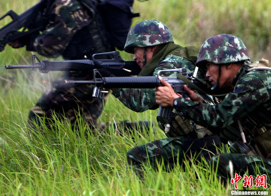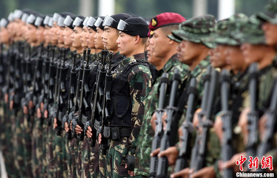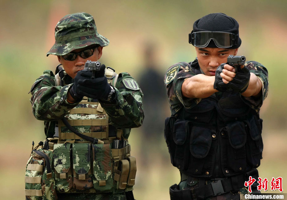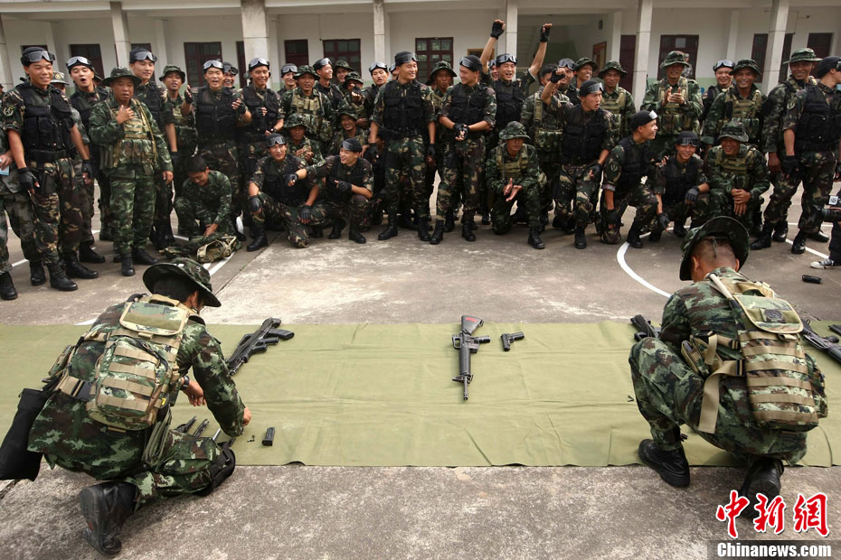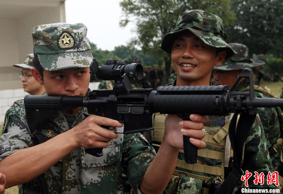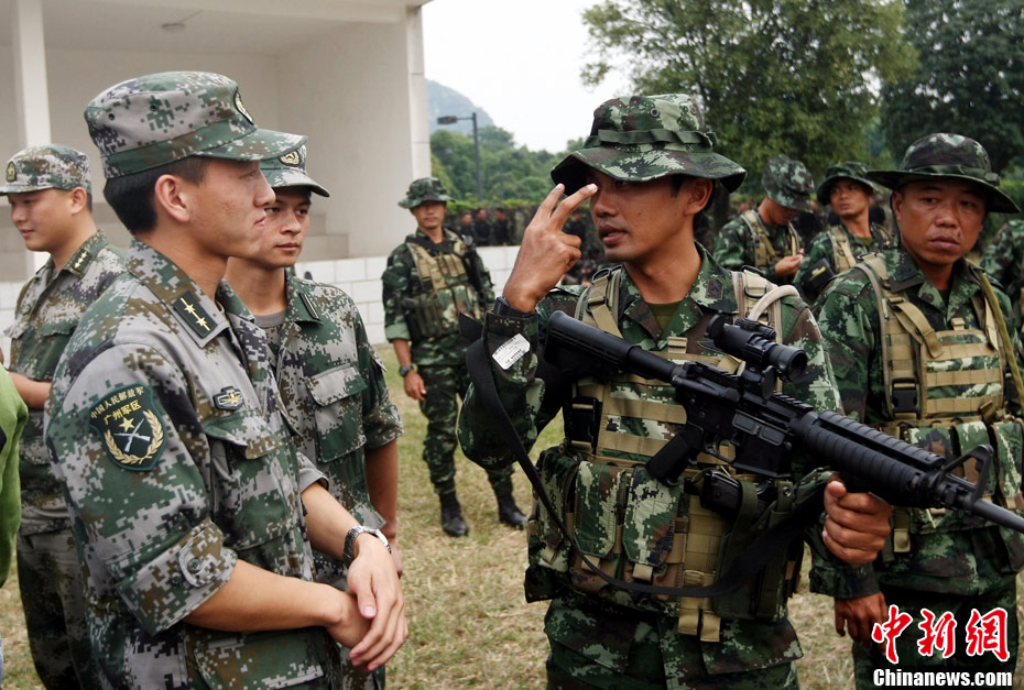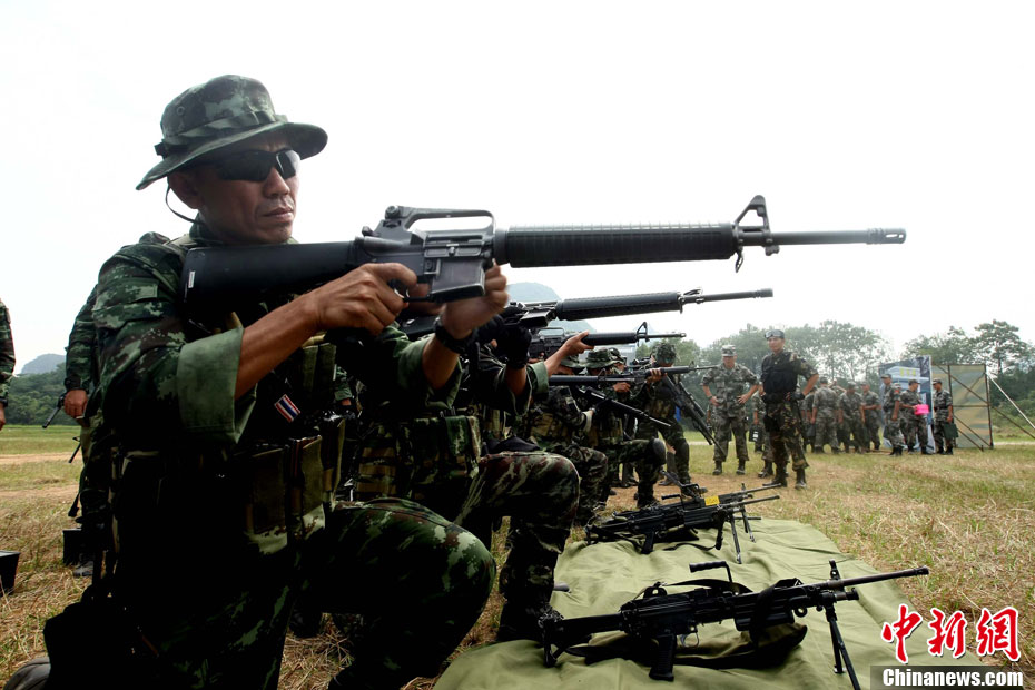 10月9日,中泰陸軍特種部隊反恐聯合訓練進入混編同訓階段,主要圍繞城市反恐基礎技能訓練、混編分隊戰術訓練等科目進行。圖為兩軍士兵進行槍械技能比賽。中新社記者 杜洋 攝