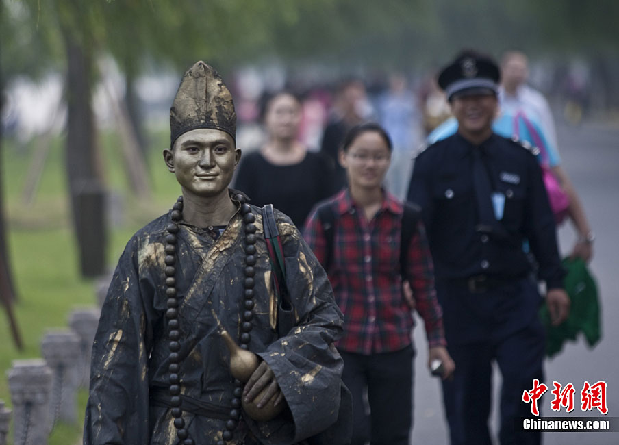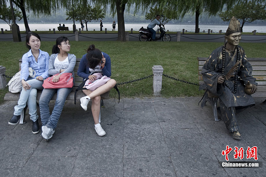 2010年10月上旬,一名打扮成濟公模樣的人在浙江省杭州市西湖白堤和游客合影,“濟公”身上涂滿了銅顏色的彩繪,看上去像雕塑一樣。據悉,這位20多歲“濟公”來自江蘇,從今年春天開始扮成“濟公”,在全國游走。和他合影需要交5元錢。許康平 攝 圖片來源:cnsphoto