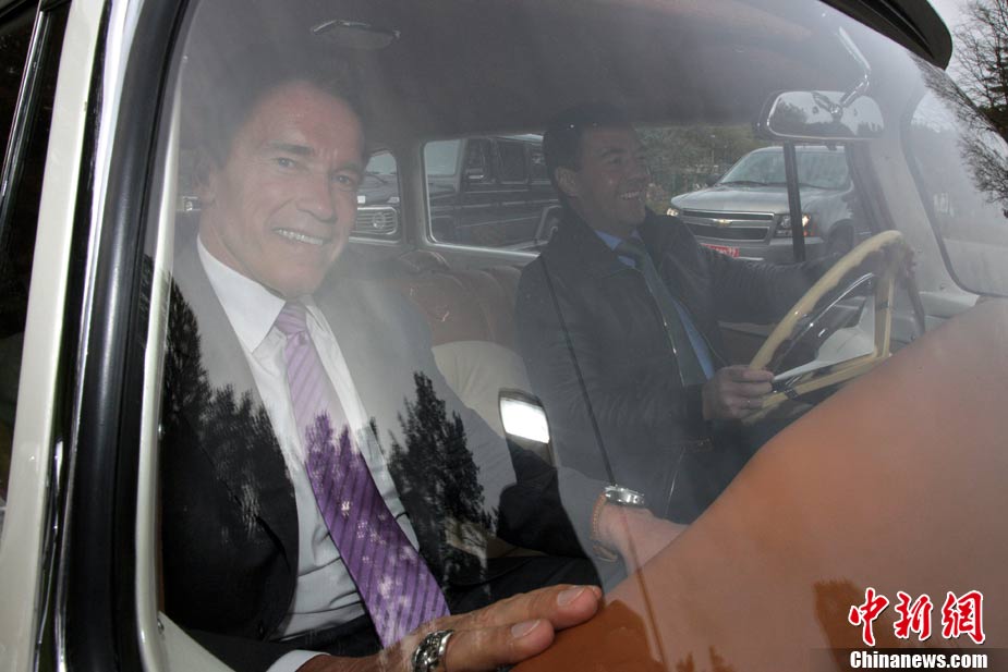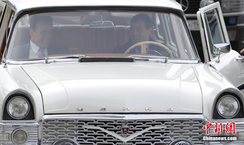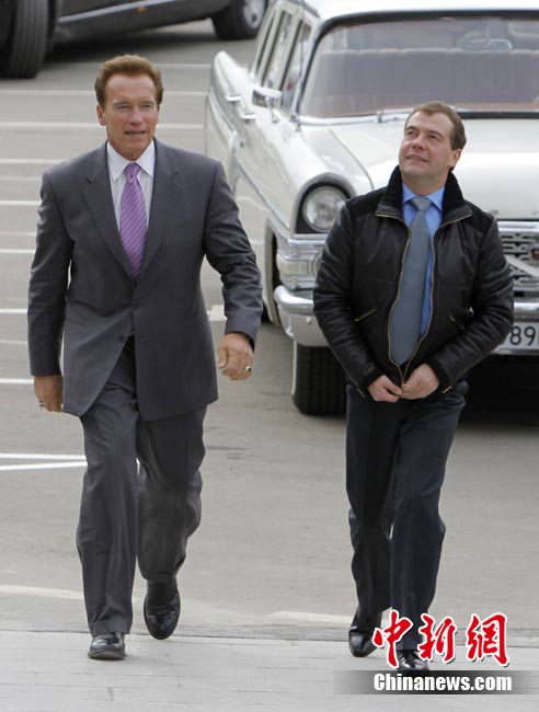10月11日,莫斯科,美國加州州長施瓦辛格訪問俄羅斯,與俄羅斯總統梅德韋杰夫會面。梅德韋杰夫總統還為施瓦辛格客串了一把“司機。”