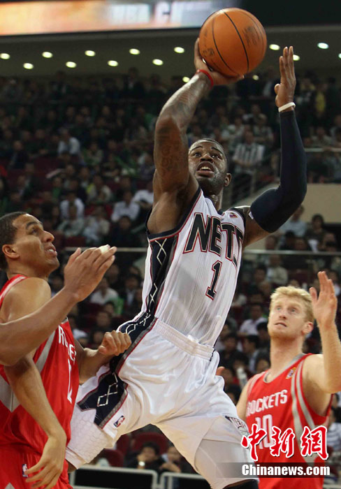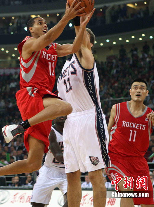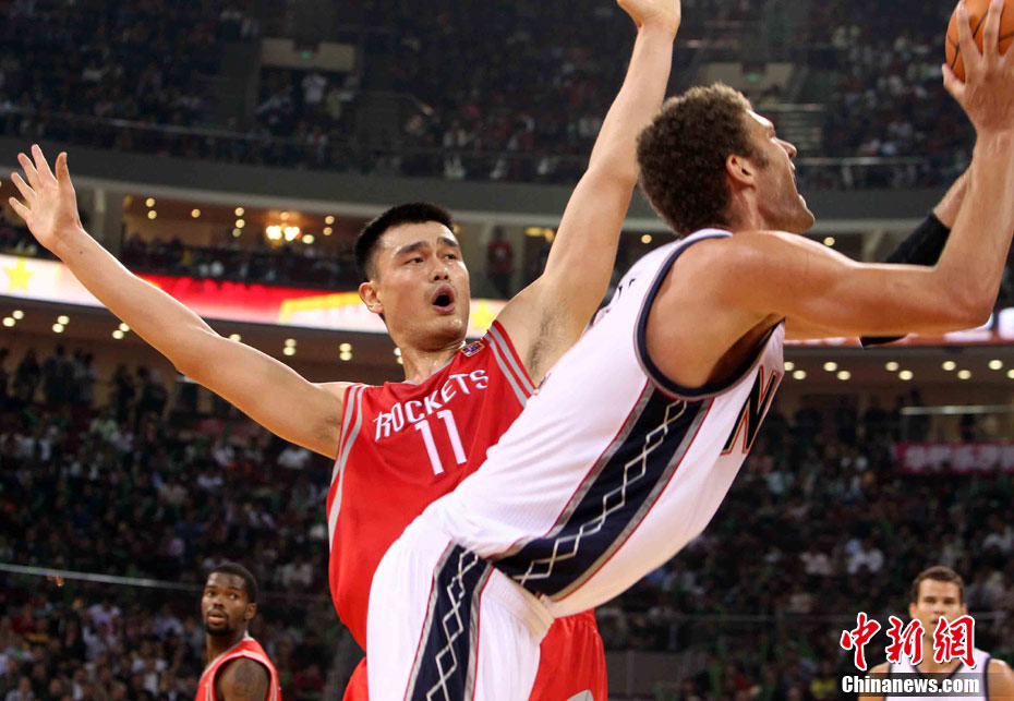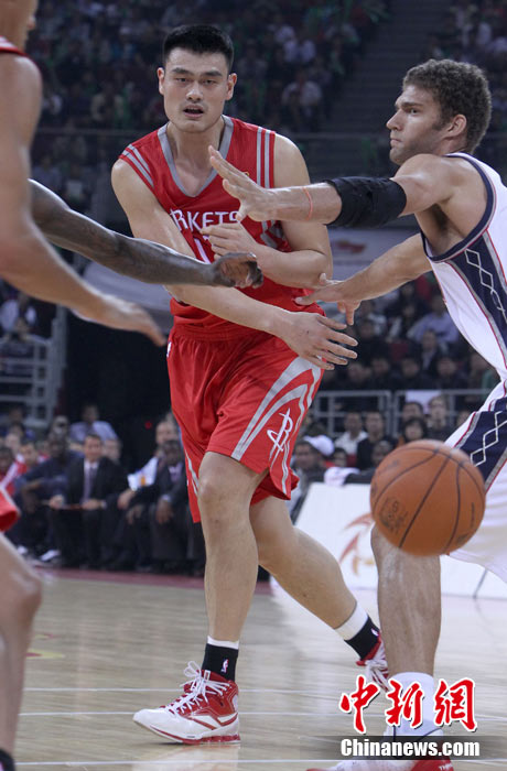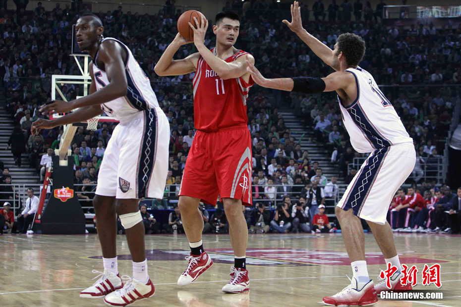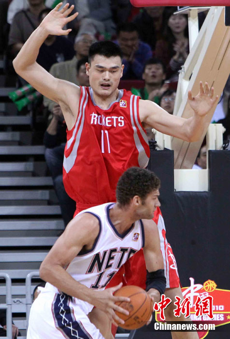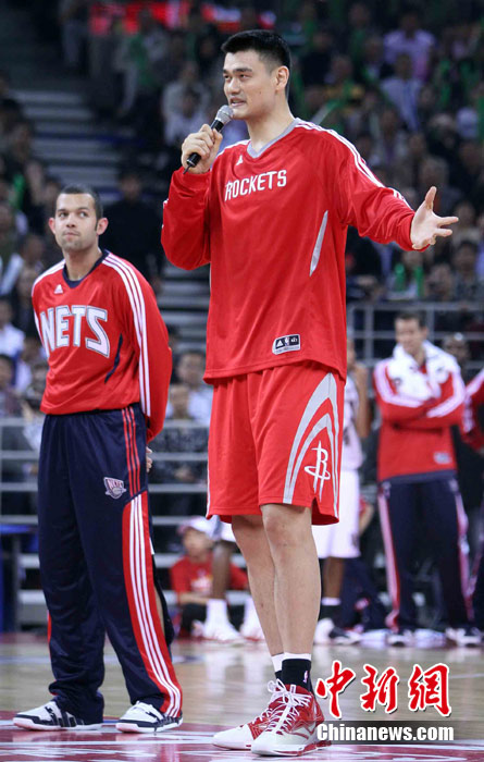 10月13日,NBA中國賽第一場比賽在北京五棵松體育館舉行,休斯敦火箭隊迎戰新澤西網隊。兩支球隊將于本月16日在廣州進行第二場比賽。圖為姚明熱身后在場邊休息。圖片來源:CFP視覺中國