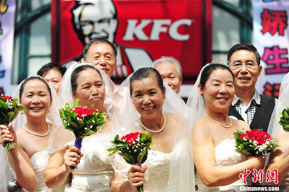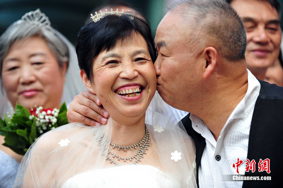 10月14日,由深圳某公司組織的老人披婚紗圓夢公益活動在東部華僑城舉行,30對結婚30年以上的老人在此歡聚一堂喜度重陽。中新社記者 陳文 攝