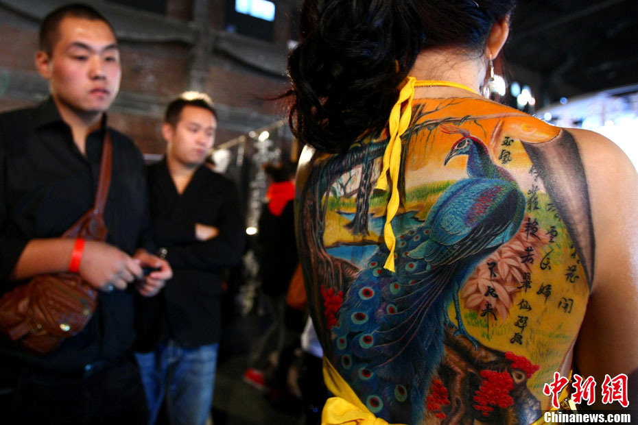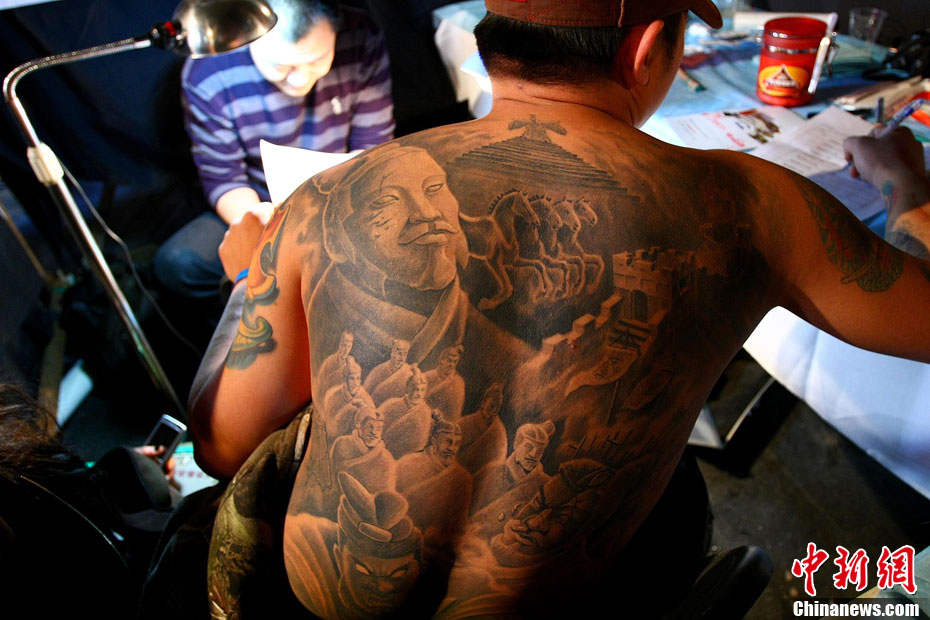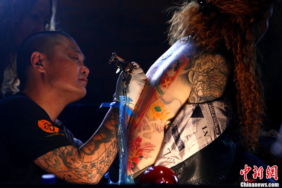 10月15日,中國(國際)紋身藝術節在北京798藝術區開幕,這是國內舉辦的首次國際性紋身藝術節。本屆紋身展會的宗旨是:“讓藝術向紋身靠攏”,為國內外紋身師提供一個公平、公正的同臺獻藝和交流的平臺。來自美國、澳大利亞、新西蘭等國以及中國許多省市的紋身師現場展示富有個性、創意十足的紋身作品。藝術節將持續至17日。 中新社發 富田 攝