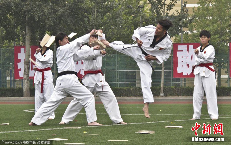 2010年10月20日,中國人民公安大學新生開學儀式在北京大興校區舉行,數百位家長親臨現場,觀摩了孩子們在開學典禮上的表演。圖為女生們表演匕首制敵的招數。蒲東峰 攝 圖片來源:CFP視覺中國