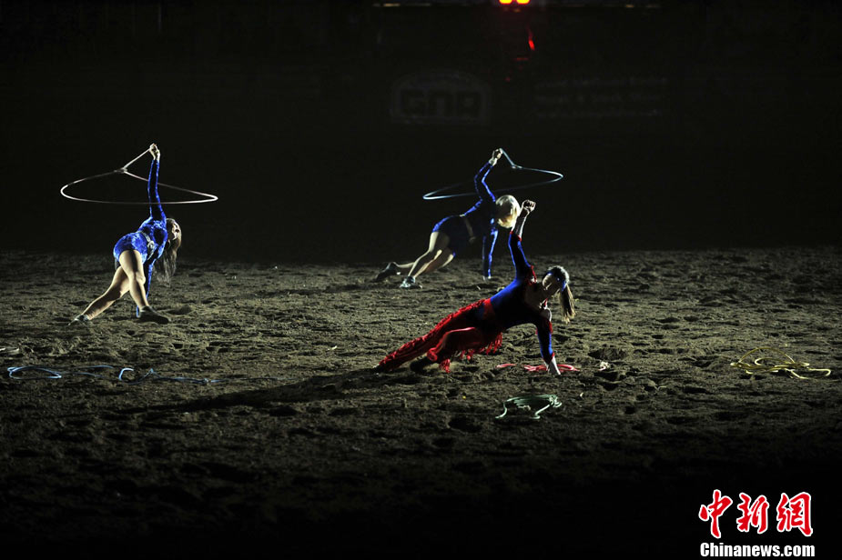 為期四日的全美騎術大會在舊金山的牛宮(Cow Palace)舉行。來自全美多個州的專業和草根牛仔參加表演,舉辦者預測將會吸引兩萬名左右的觀眾前來參觀。舊金山的全美騎術大會始于1941年,是全美專業騎術大會的前奏。圖為一名牛仔在努力馴服烈馬。中新社發 陳鋼 攝