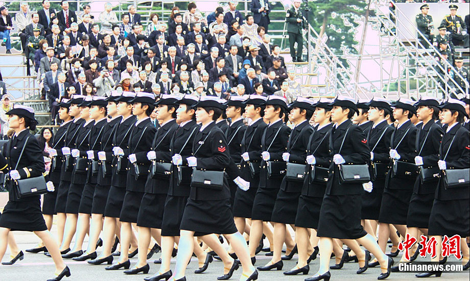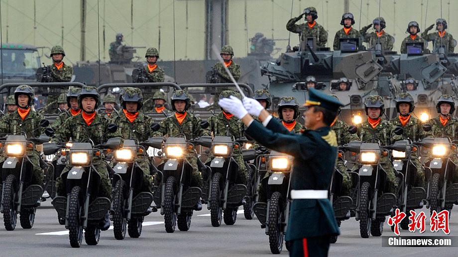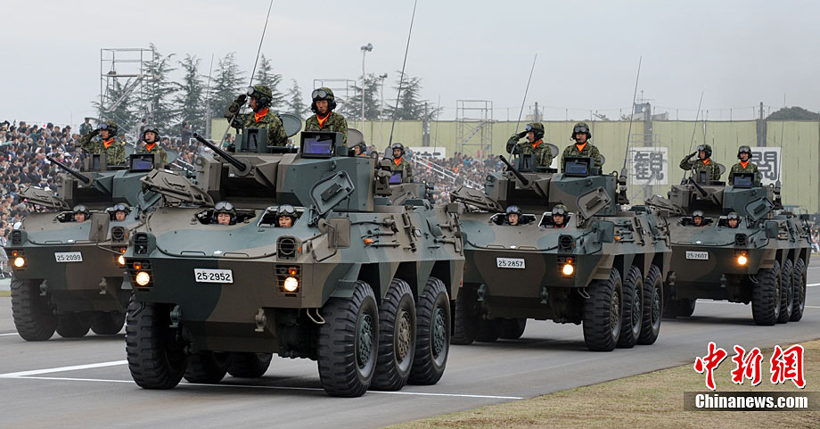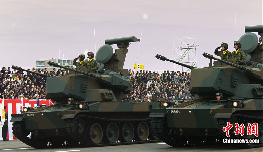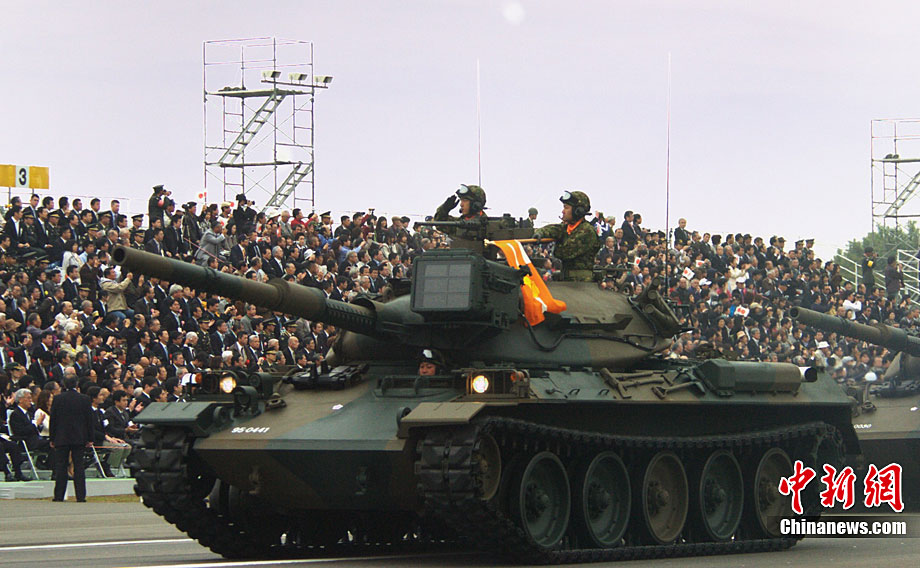 10月24日,日本自衛隊在位于埼玉縣的朝霞訓練場舉行了三年一度的海陸空閱兵式,首相菅直人檢閱了部隊并訓話。參加本次閱兵式的自衛隊員共有3800余人,分別來自海、陸、空3軍的26支部隊。閱兵式上,自衛隊展示了各式戰機60余架,坦克、裝甲車等240輛。