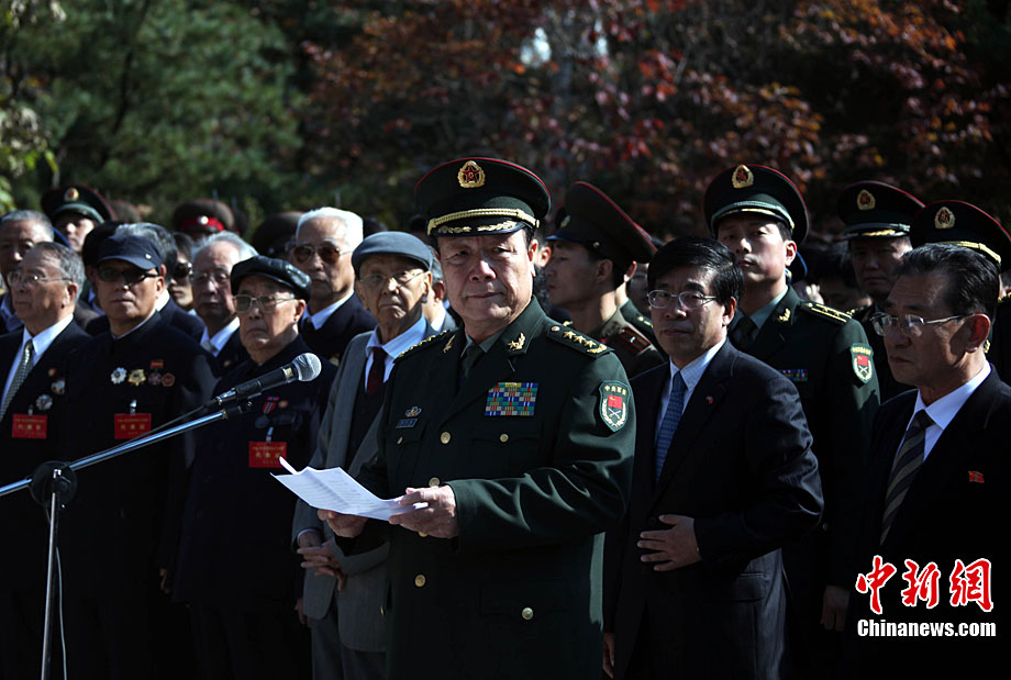 10月24日晚,朝鮮政府在平壤人民文化宮舉行盛大宴會,隆重紀念中國人民志愿軍赴朝參戰60周年。率領中國高級軍事代表團訪朝的中央軍委副主席郭伯雄(中)、朝內閣總理崔永林(右)等出席宴會。 中新社發 孫自法 攝