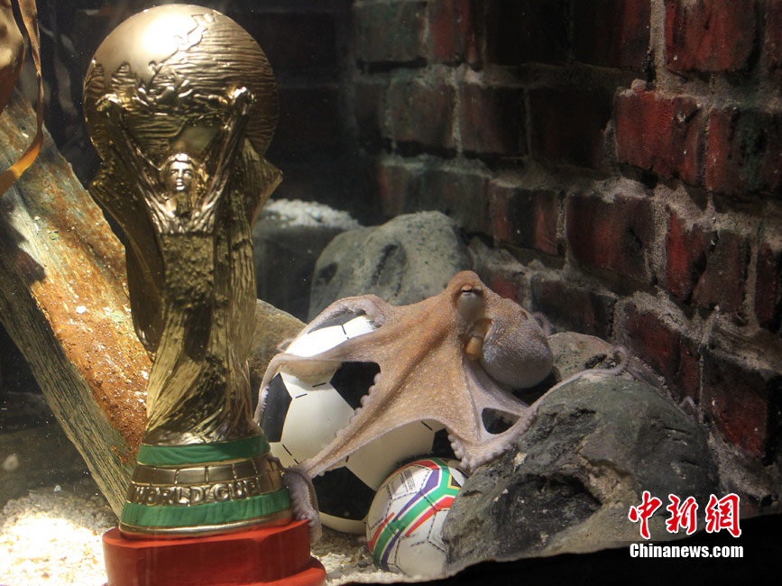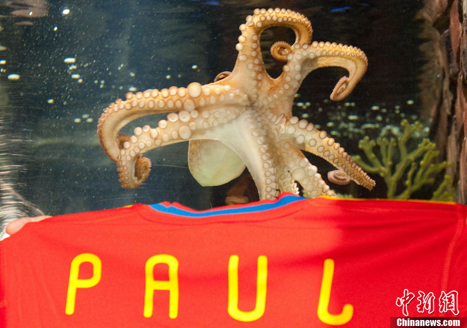 據悉,保羅的尸體目前已被冷藏,水族館正在商討“怎樣以最好的形式紀念”。圖為在世界杯后章魚保羅獲贈一件印有它名字的西班牙隊隊服。
