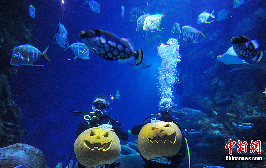 當地時間10月27日,英國倫敦,潛水員在水下雕刻南瓜鬼臉,宣傳本周末倫敦水族館的萬圣節特別活動。