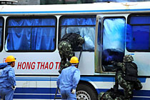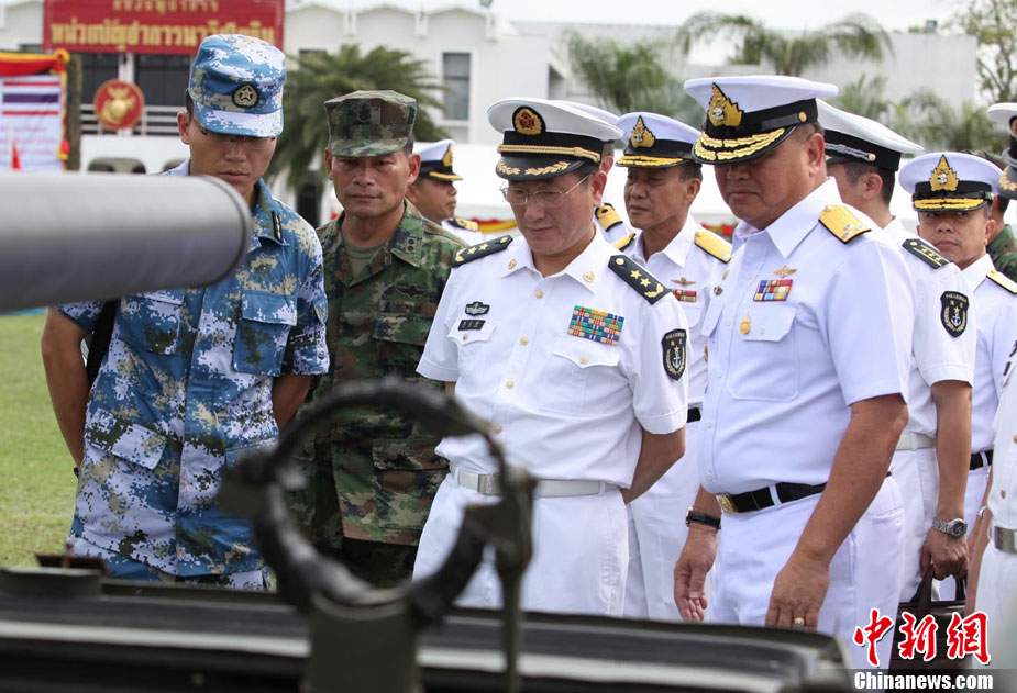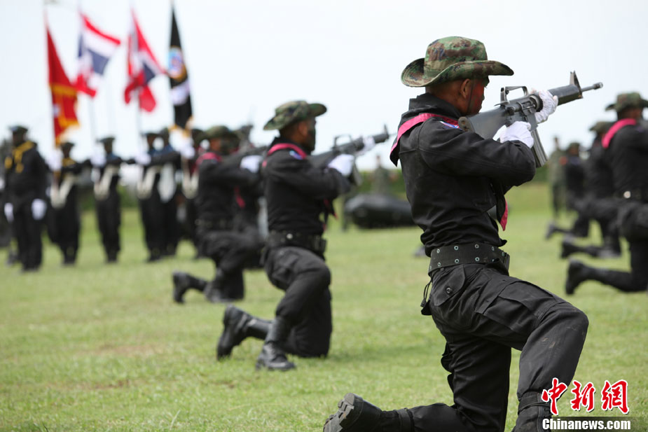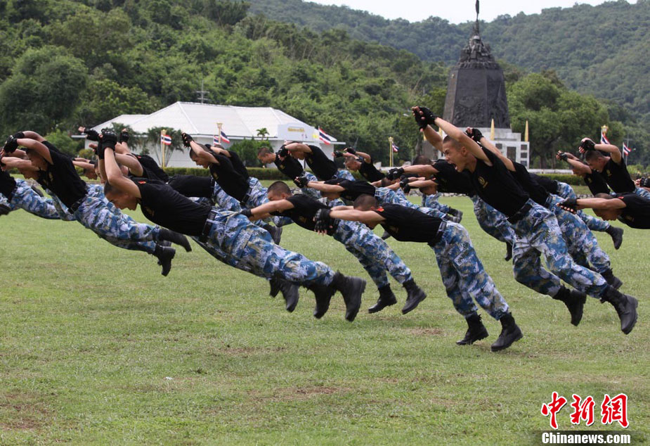 10月28日,代號為“藍色突擊—2010”的中、泰海軍陸戰隊聯合訓練在泰國梭桃邑海軍基地拉開帷幕。圖為中國海軍陸戰隊參訓官兵在開訓儀式進行技能演示。中新社記者 余顯倫 攝