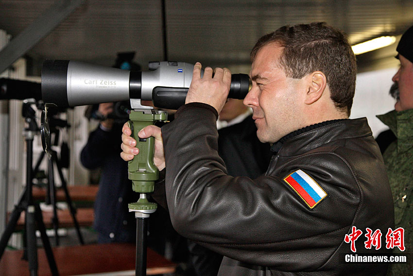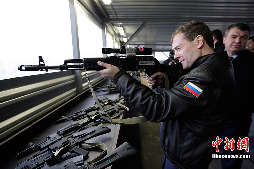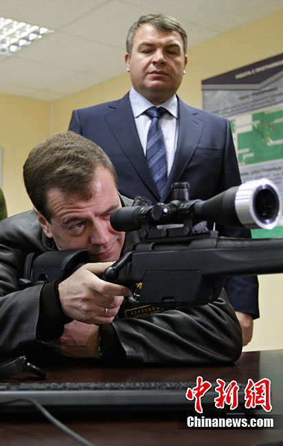 當(dāng)?shù)貢r(shí)間10月28日,俄羅斯索爾涅奇諾戈?duì)査箍耍砹_斯總統(tǒng)梅德韋杰夫在參觀國(guó)防部訓(xùn)練中心時(shí)檢查一支狙擊步槍。